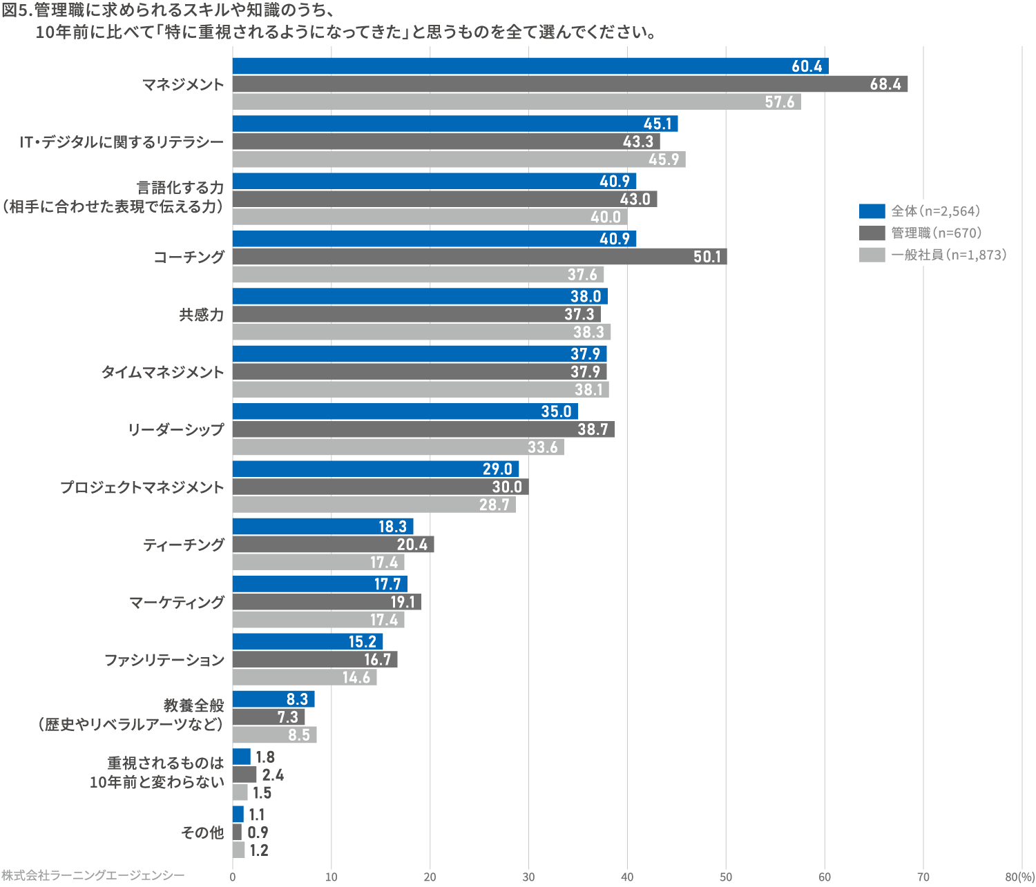 管理職に求められるスキルや知識のうち、特に重視されるようになってきたものを尋ねる質問では、「マネジメント(60.4%)」が最多で6割超え。次いで「IT・デジタルに関するリテラシー(45.1%)」「言語化する力(相手に合わせた表現で伝える力)(40.9%)」が続いております(図5)。