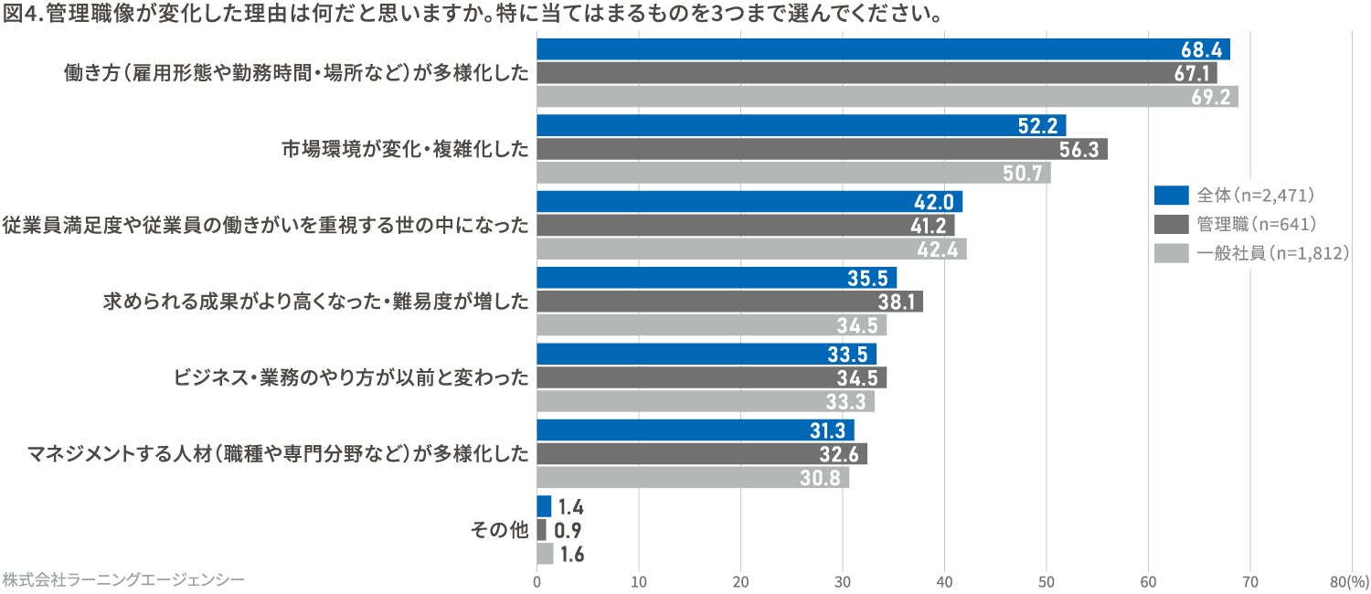 管理職像が変化した理由は、「働き方が多様化した(68.4%)」が最多、「市場環境が変化・複雑化した(52.2%)」と続きました(図4)。新型コロナウイルスをきっかけにリモートワークなどの働き方改革が加速し、また今まで通りのビジネスのやり方ではうまくいかないケースが多数発生しました。これらの変化が管理職像へ大きく影響を与えたと推察されます。