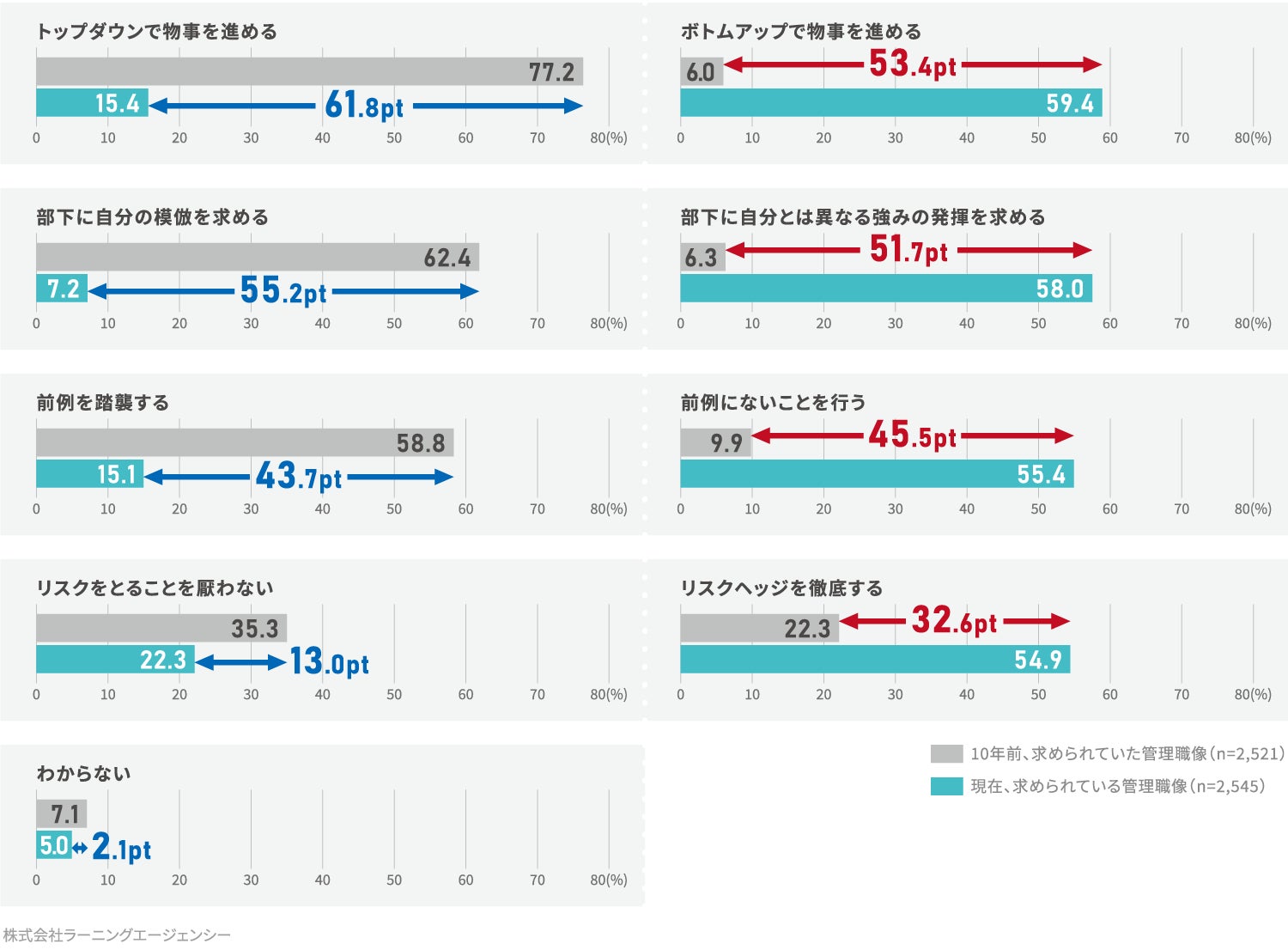 また、10年前と現在の求められる管理職像で、最も減少した項目は「トップダウンで物事を進める(10年前:77.2% 現在:15.4%)」。続いて「部下に自分の模倣を求める(10年前:62.4% 現在:7.2%)」、「前例を踏襲する(10年前:58.8% 現在:15.1%)」でした。管理職とは正解を持っていること、それを部下が模倣し成果を出すことが10年前の管理職の姿だったのでしょう。しかし、これまでのやり方が通用しないほど、会社を取り巻く環境変化が大きくなった結果、管理職自身が正解を指し示すことが困難となり、対話・ボトムアップで正解を一緒に考え動くことが求められるようになったのだと推察されます。