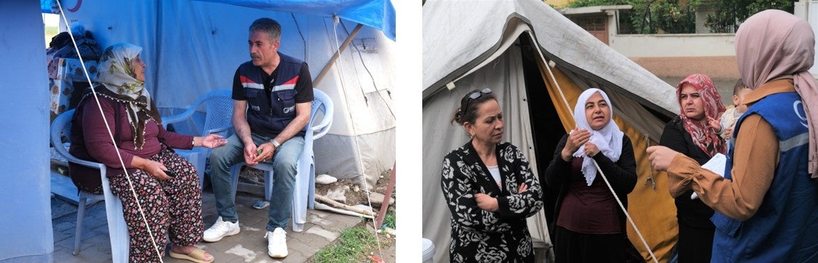 (写真:2023年5月末、被災者への戸別訪問。テントやバラックでの避難が続いています)
