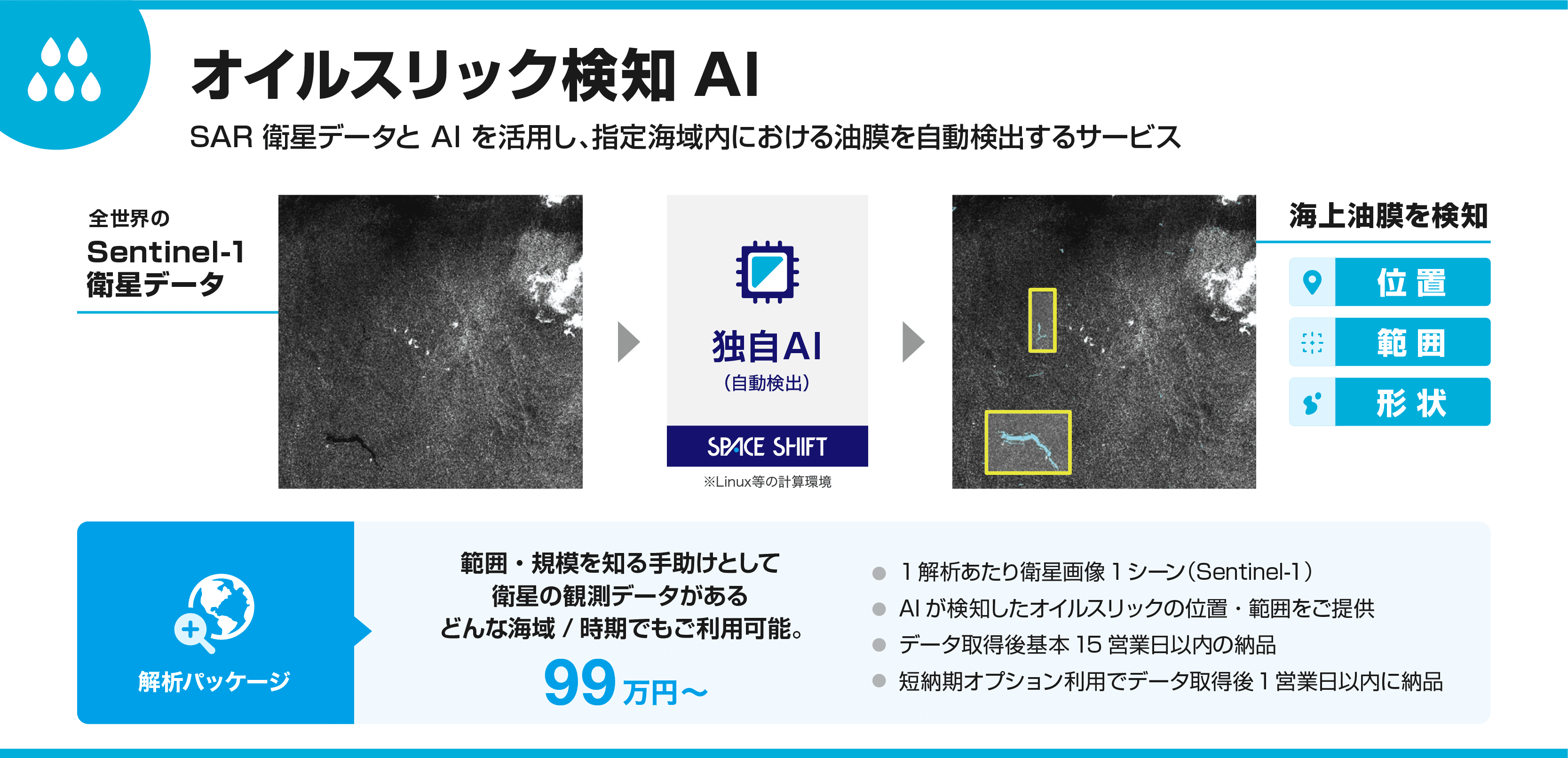 オイルスリック検知 AI は、主にSAR衛星データを活用し、海面に発生する油膜(オイルスリック)をAIが自動検知する解析サービスです。