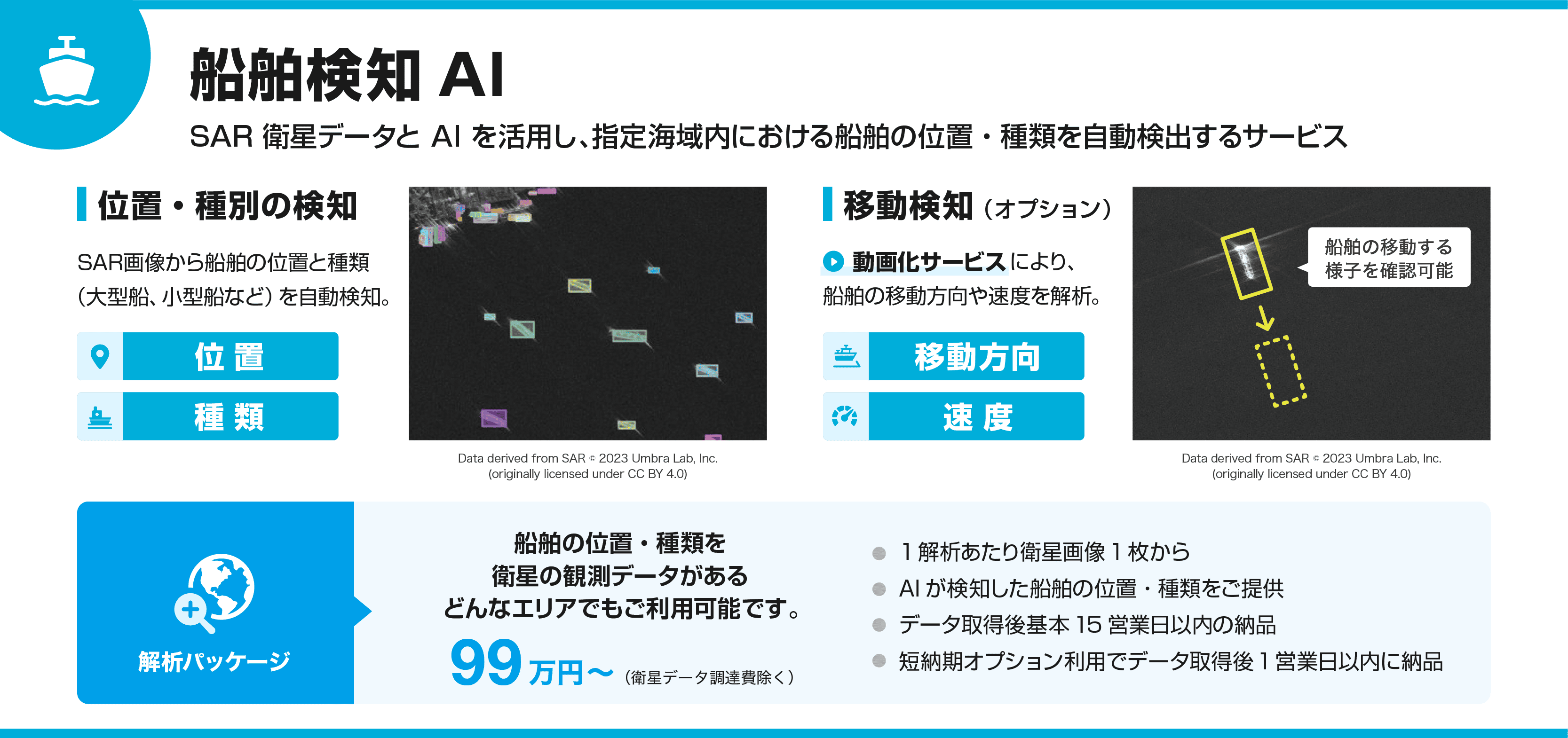 船舶検知 AI は、SAR(合成開口レーダー)衛星データを用いて海上の船舶をAIが自動検出・可視化する解析サービスです。