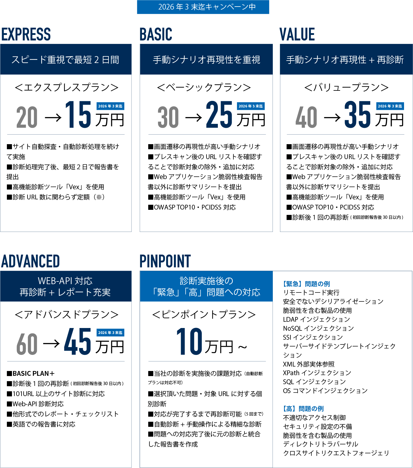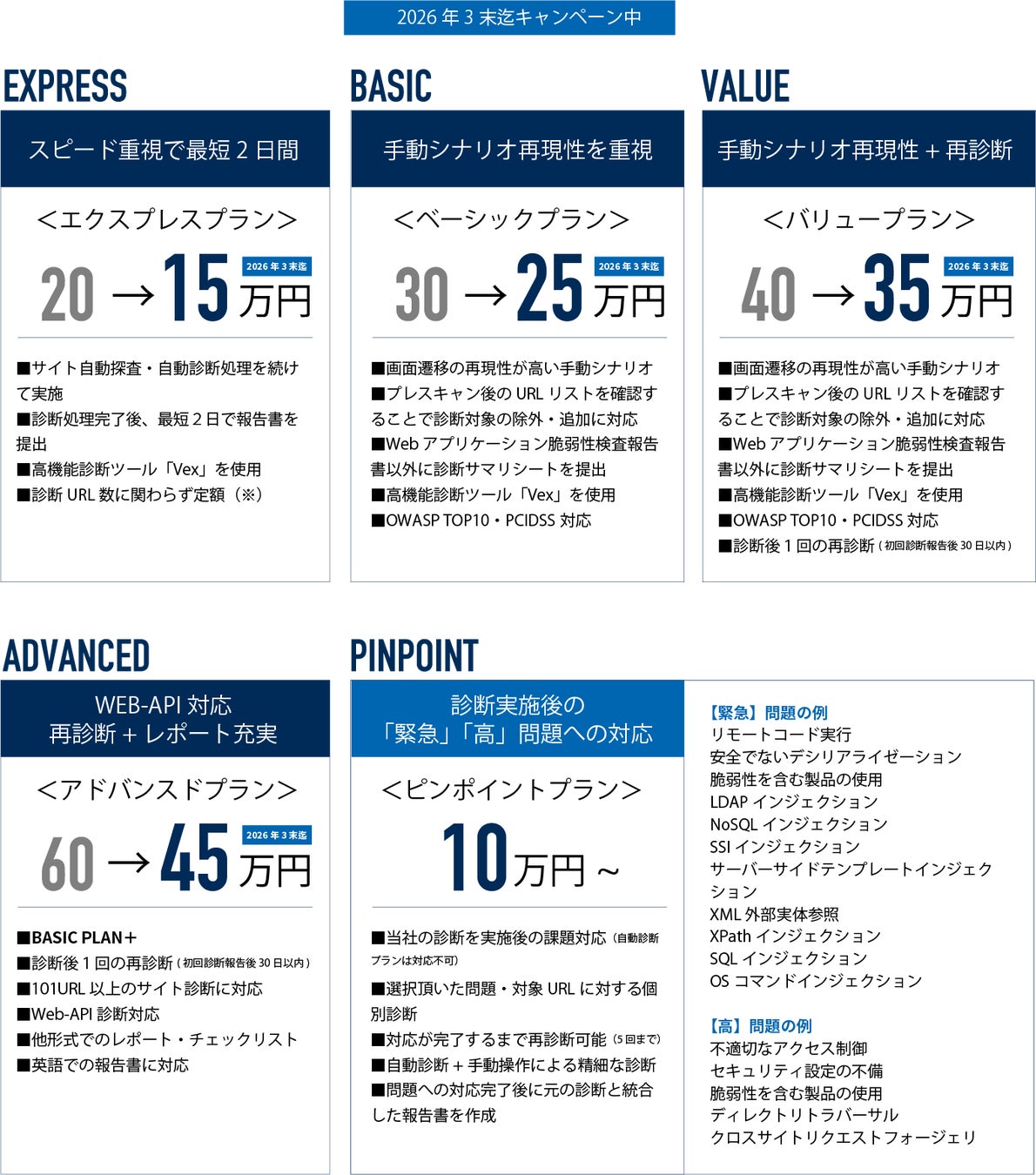 【診断件数1000社突破!期間限定キャンペーン】脆弱性診断メニュー、フルリニューアル!最短2日、最大15万円お得に診断可能。