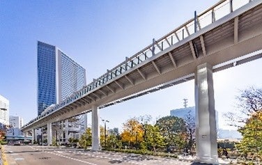 浜離宮・旧芝離宮庭園景観形成特別地区の区域内であることから、庭園内からの見え方を港区・景観アドバイザーを含めた関係各者と協議し、歩行者デッキは白色のトーンを基調に統一し、橋脚や桁を面が小さく見える多角形とするなど、周辺景観に違和感なく溶け込むことを企図しました。