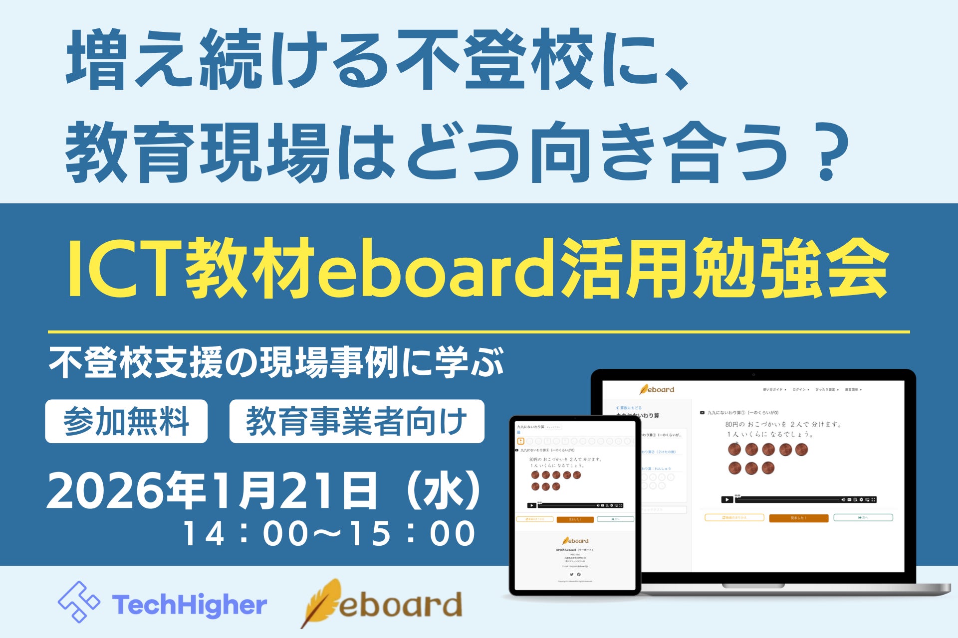 10代向けデジタル人材育成サービス「TechHigher」を運営する株式会社エクシード(本社:東京都渋谷区、代表取締役:澤部愛子)は、NPO法人eboard(本部:兵庫県西宮市、代表理事:中村孝一)が提供する、不登校の子どもたちの学びを支えるICT教材「eboard」をテーマとしたオンライン勉強会を、2026年1月21日(水)に開催します。