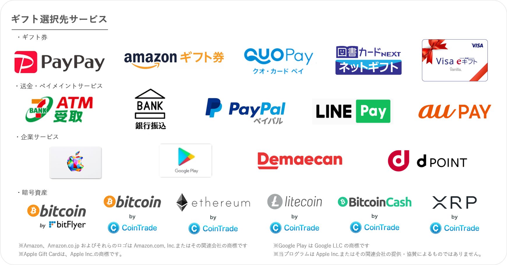 アンケート回答、資料請求、お見積もりの謝礼、社内イベントのインセンティブ、etc.