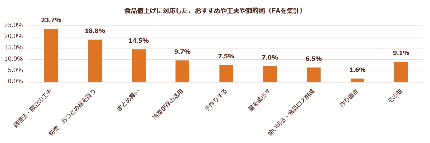 ・サラダ油が値上がりしたので、揚げずに揚げ物風の料理を工夫して作っています。節約になるし、カロリーも抑られるので、おすすめです。(長崎県・20代・女性)・残り物をアレンジし、違ったメニューに変える。例えば、肉じゃがをコロッケにする。(大阪府・60代・女性)