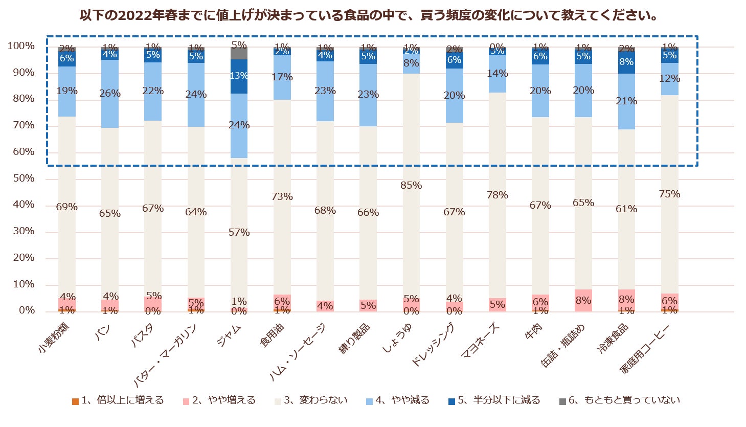食品値上げによる家計負担の実感を聞いたところ、86%が「負担を感じる」、うち47%は「とても感じる」と回答しました。また、値上げが予定されている食品等について、今後の購入頻度の変化について聞いたところ、約2割が「減る」と回答。中でも「減る」という回答が多い上位3カテゴリは、「ジャム」(37%)、「冷凍食品」(30%)、「パン」(30%)と、いずれも30%を超える結果となりました。