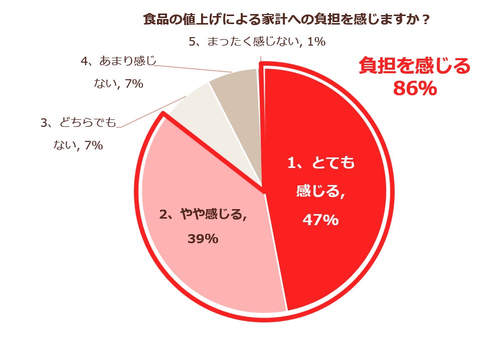- 86%が「食品値上げによる家計への負担を感じる」と回答。