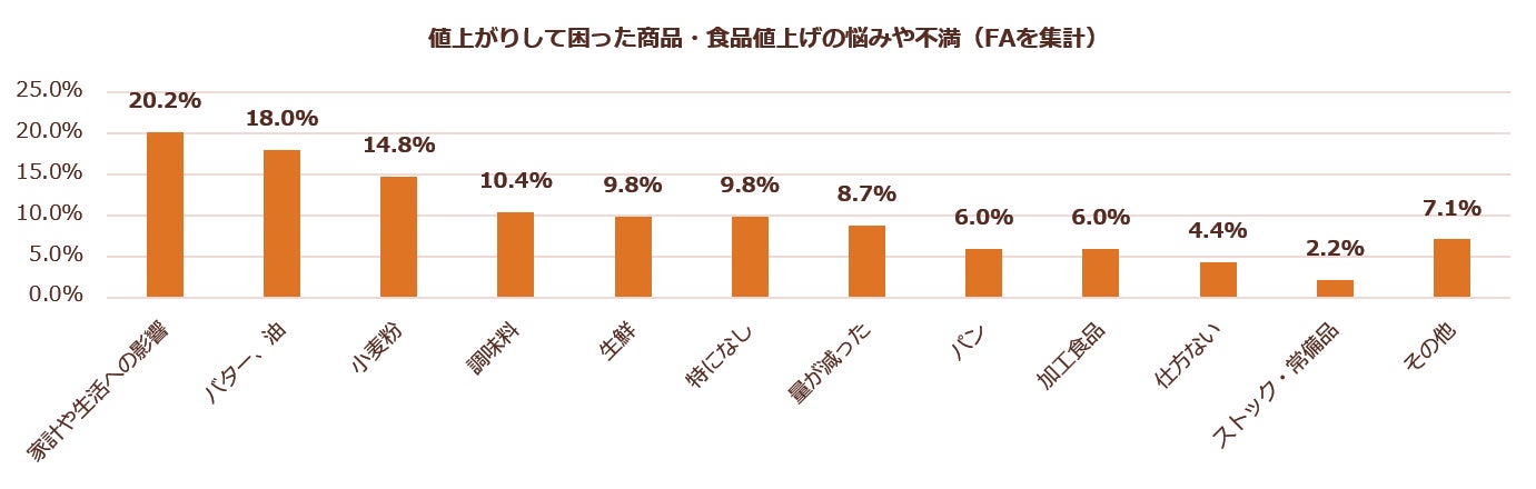 - 値上がりの実感や、値上げに対する悩みは、家計への影響が最多。一方で「しかたない」の声も。