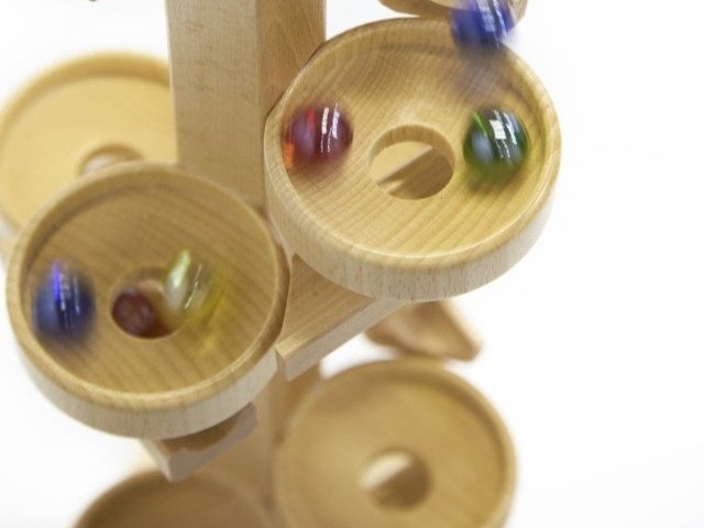 丸いトレイの中をクルクルと回るガラス玉。穴に吸い込まれるように落ちて転がっていく動きに誰もがじっと見入ってしまう。後から落とした玉と順番が入れ替わることもあり、予測不能な面白さが含まれている。最後に聞こえるシロフォンの音まで優しい。
