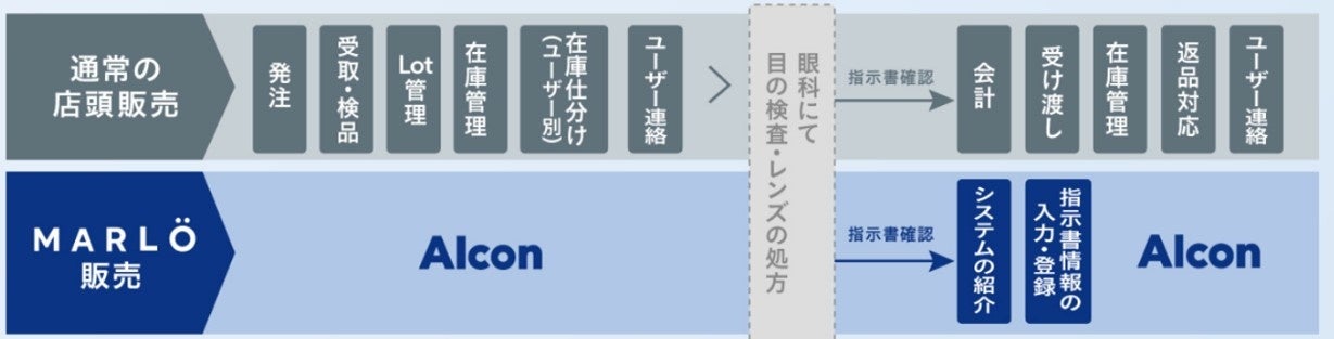 「MARLÖ」は、コンタクトレンズ販売店を販売主体(注2)とし、販売店自身が「MARLÖ」で取り扱うアルコンの製品(注3)の価格設定を行っていただくことになります。また、販売店がユーザーの要望に応じて、「MARLÖ」上でコンタクトレンズを代理注文する機能や、店頭での決済機能、アルコン製品のオンラインと店頭販売の双方の売上構成比を「MARLÖ」で確認できる機能も備えています。