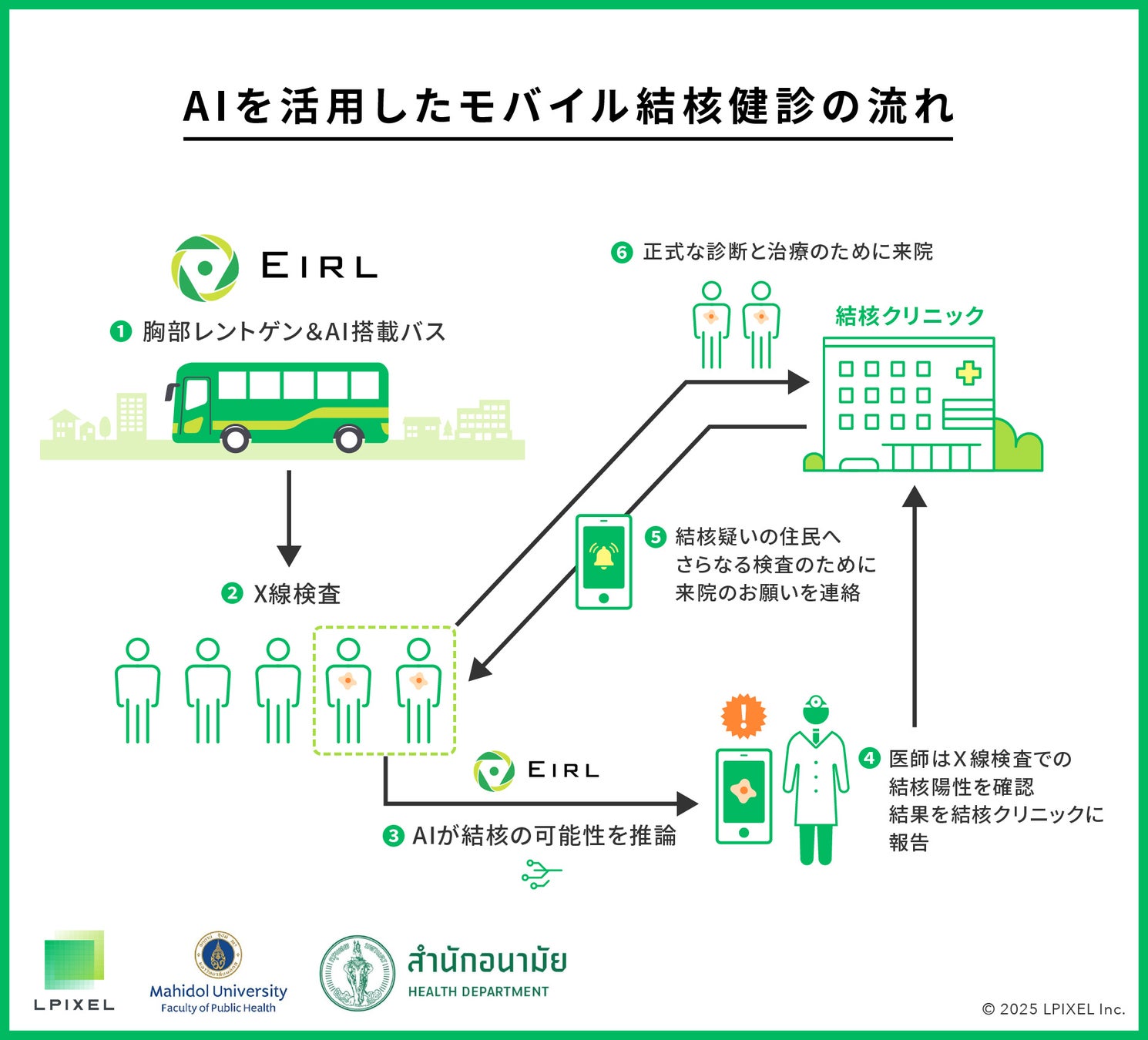 2025年1月27日(月)、マヒドン大学公衆衛生学部とエルピクセル株式会社(本社:東京都千代田区、代表取締役:鎌田富久、以下「エルピクセル」)は、2025年3月より実証事業として、Artificial Intelligence (AI)を活用したモバイル結核検診(X線撮影装置を搭載したバス)の運行開始を発表いたしました。本実証事業は、2024年9月にマヒドン大学とエルピクセルが締結した研究契約に基づき、バンコク都庁の協力を得て実施いたします。