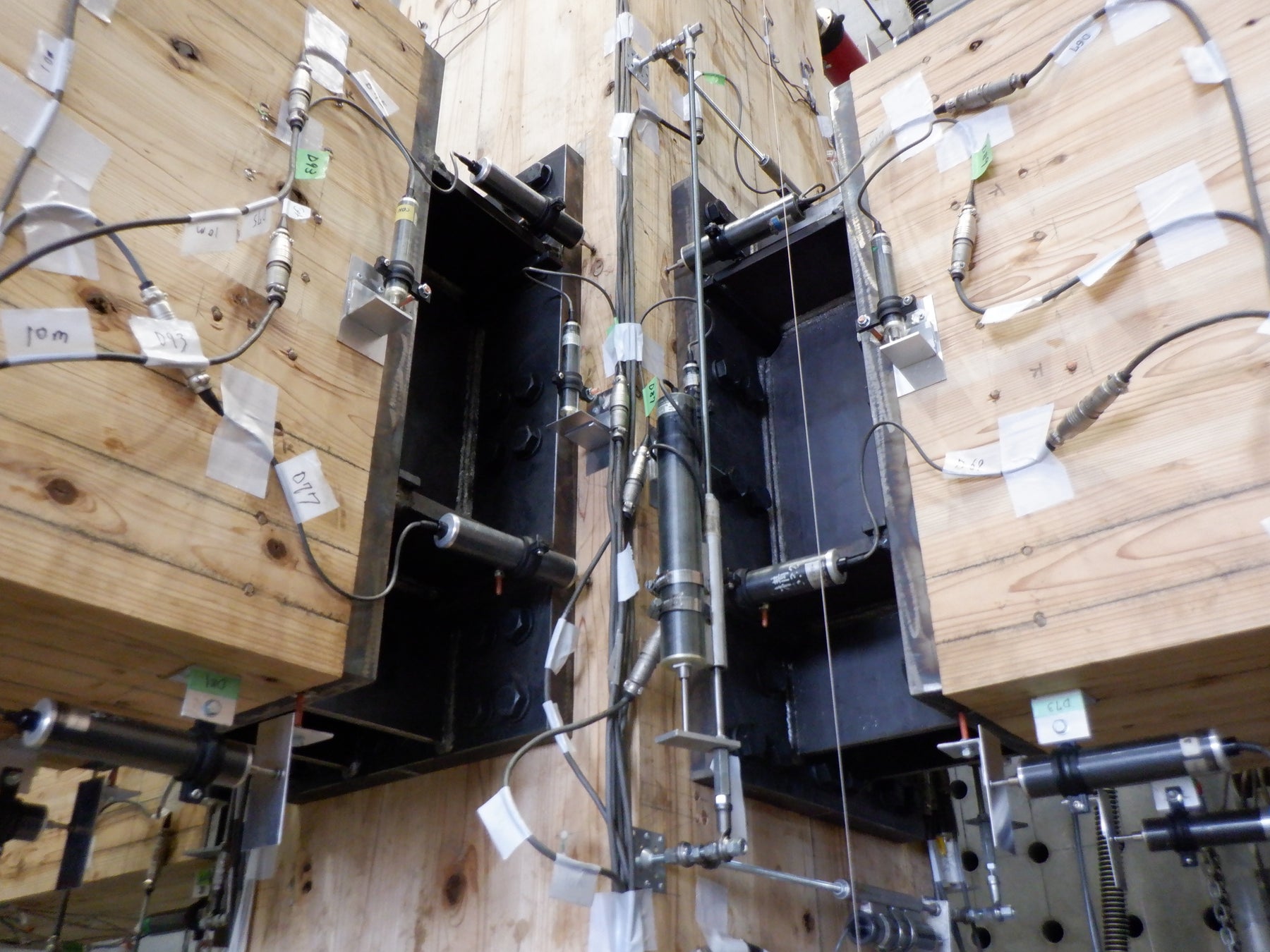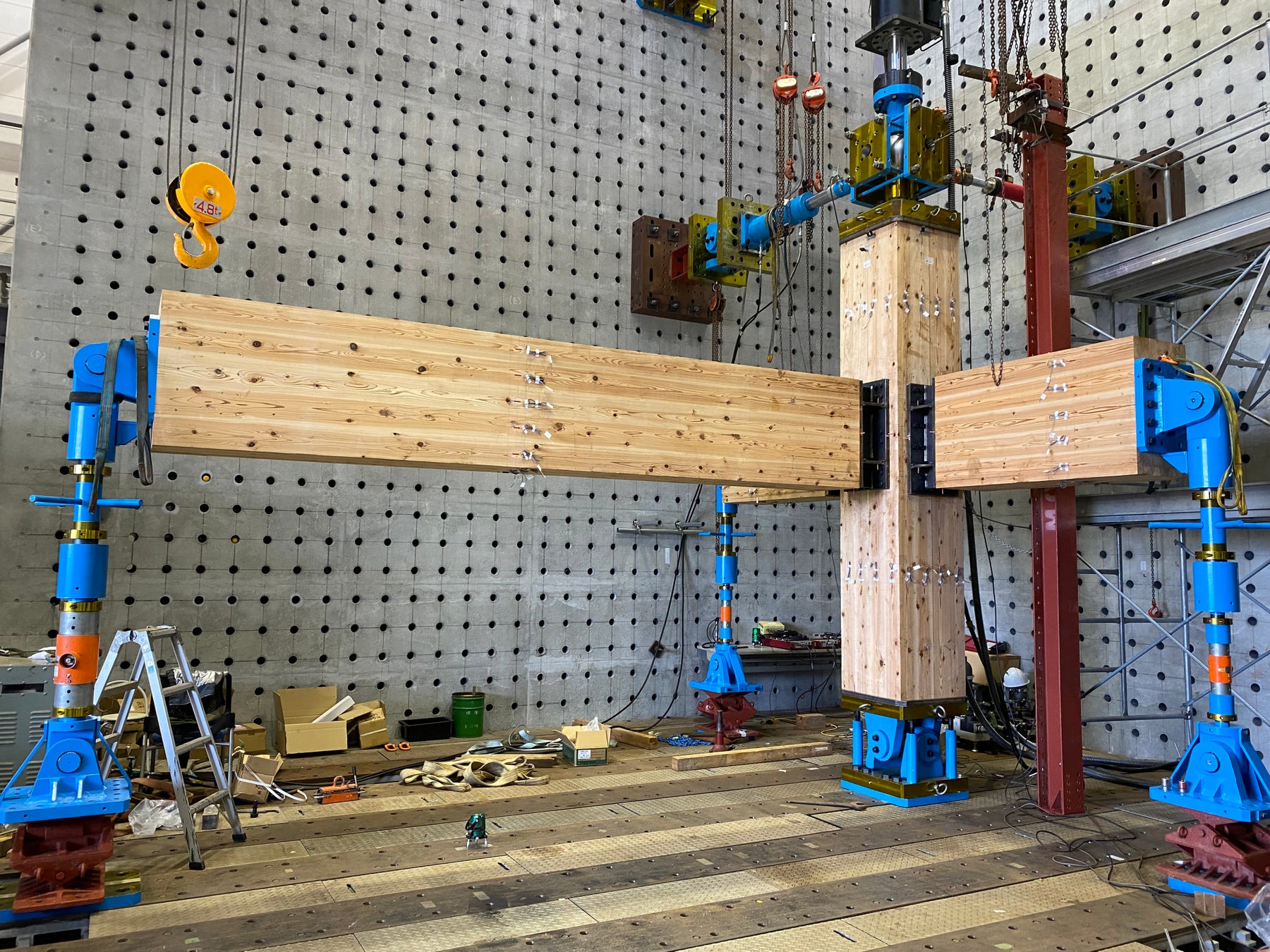 本接合構法の構造設計・構造計算時のモデル化・仮定条件の妥当性を検証するため、実大木造2方向ラーメン架構試験体の加力実験を実施しました。長期荷重相当の鉛直軸力、2方向水平力が作用する状況においても、安定した荷重―変形関係が確認出来ました。実験結果に基づいた構造設計法については、2023年11月10日に一般社団法人日本建築センターの個別評定※を取得しています。
