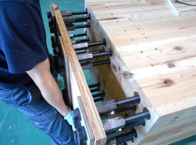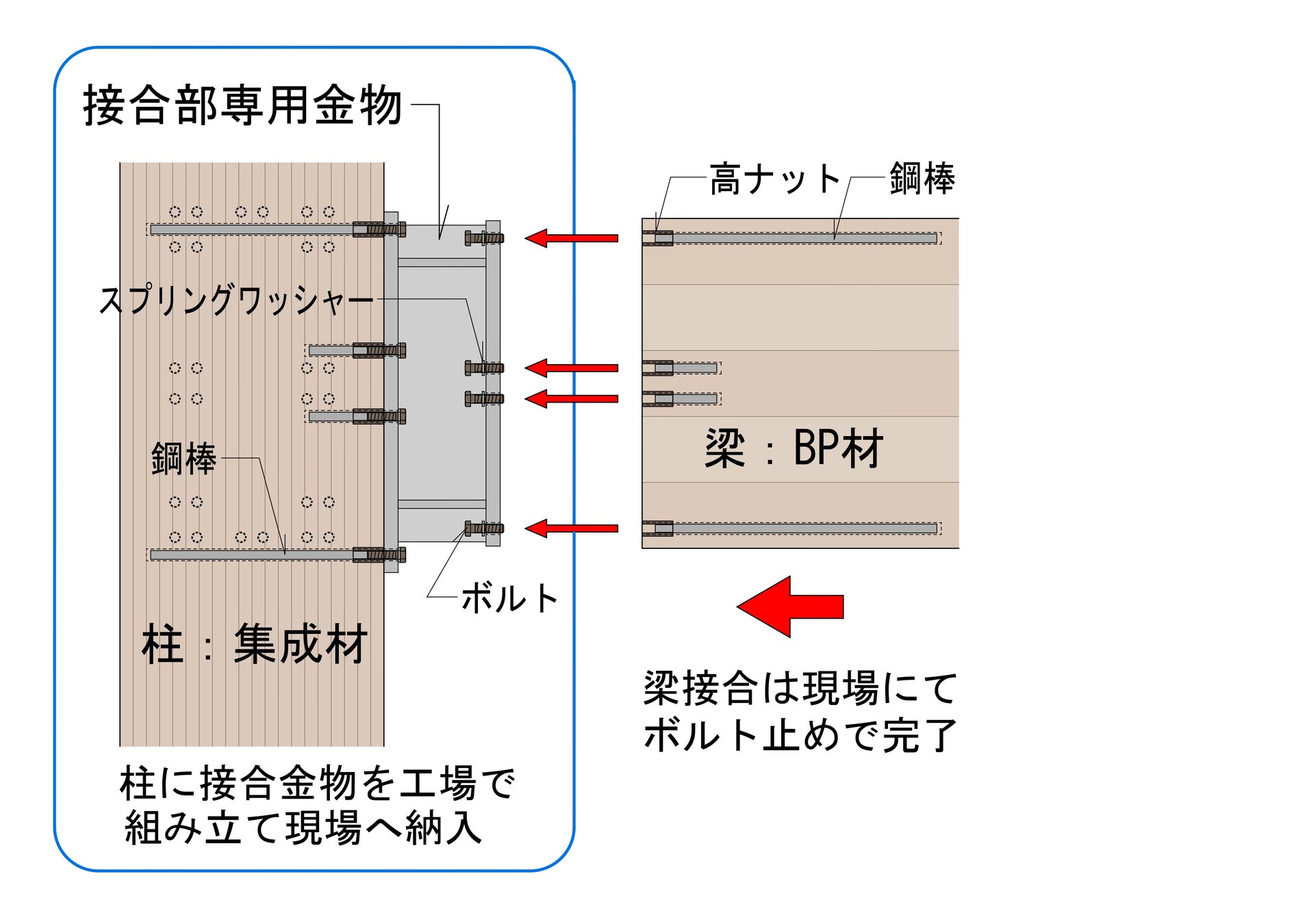 従来の木造接合方法である、埋め込みロッドによる接合「グルード・イン・ロッド接合」(GIR接合)は、鋼棒の挿入や接着剤の注入をすべて現場で行う必要があり、大きな施工時間と手間を要します。これに対し、本構法は、接合専用治具を取り付けた柱と、予め工場で鋼棒・高ナットを挿入し接着剤で固定した梁を、現場に搬入し、現場ではボルト締結するだけで完了するというものです。現場での作業を大幅に省力化でき、従来のGIR接合に比べて大幅な工期短縮を見込めます。