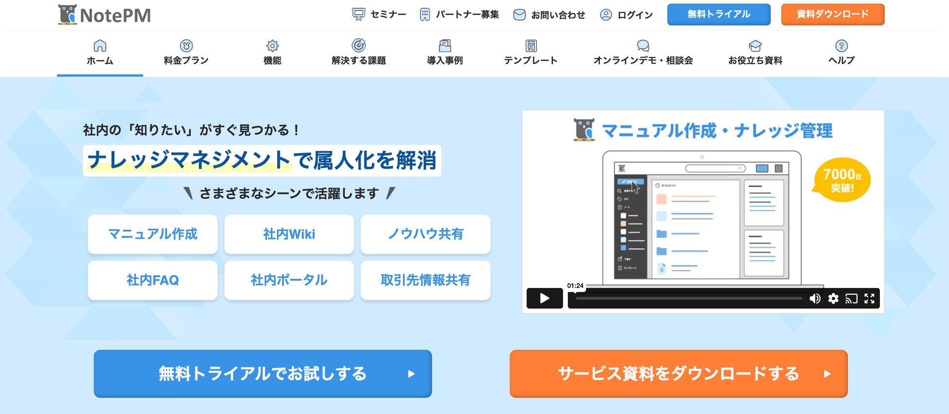 NotePM(ノートピーエム)は、マニュアルやノウハウを簡単に投稿できて、強力な検索機能でほしい情報をすぐ見つけられるサービスです。マニュアル、手順書、業務ノウハウ、社内FAQ、日報・議事録など、何度も検索するような、ストック型の情報管理に最適です。