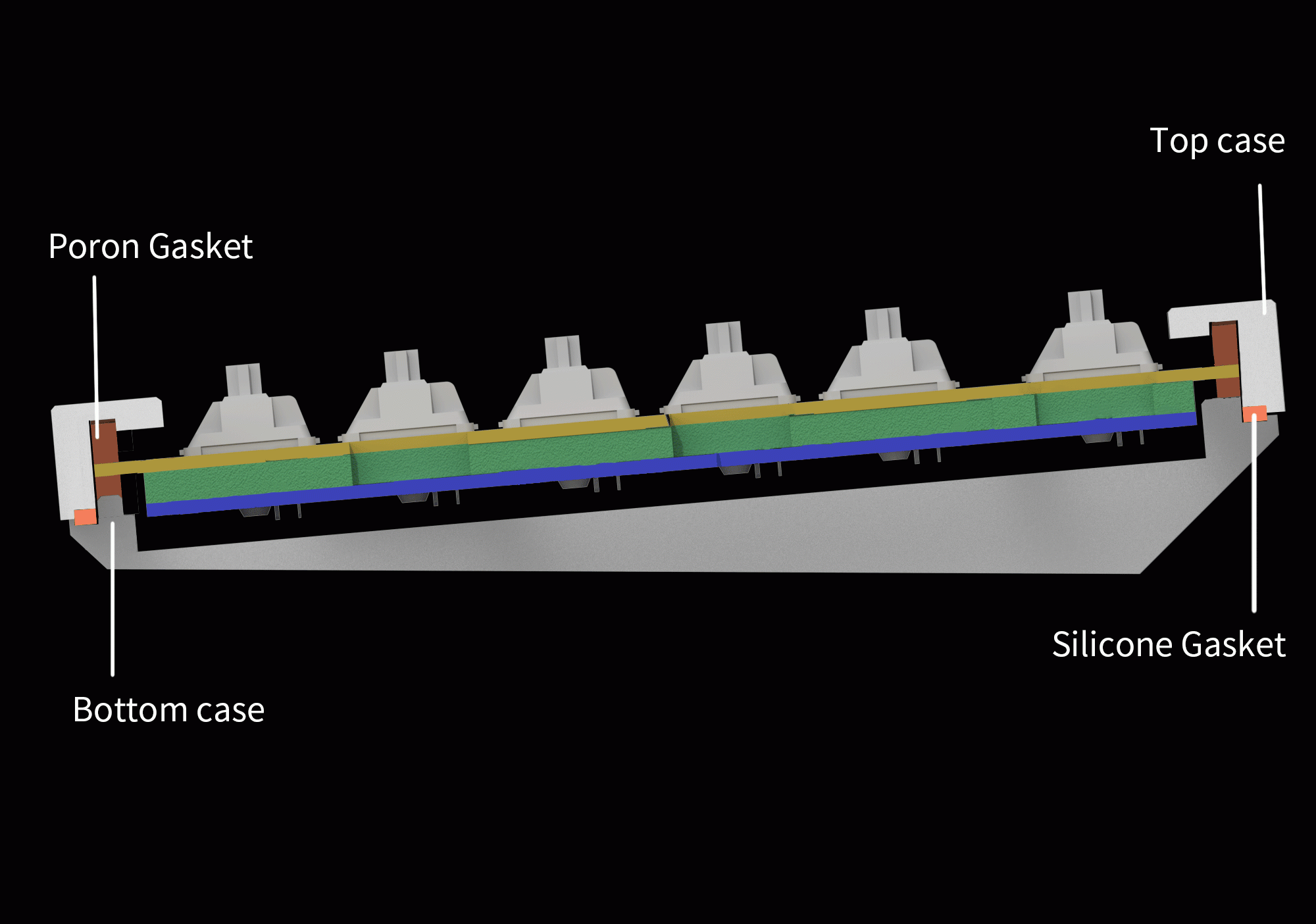 ダブルガスケット設計は、業界における革新的な構造と言えるでしょう。プレート上のガスケットに加え、トップケースとボトムケースの間にシリコンパッドを追加しました。金属間の共振を大幅に低減し、この結果、衝撃を受けた金属のノイズを低減することができます。このダブルガスケット構造により、ガスケット構造の柔軟性を維持したまま、キーボード全体の打鍵音を良くすることができます。