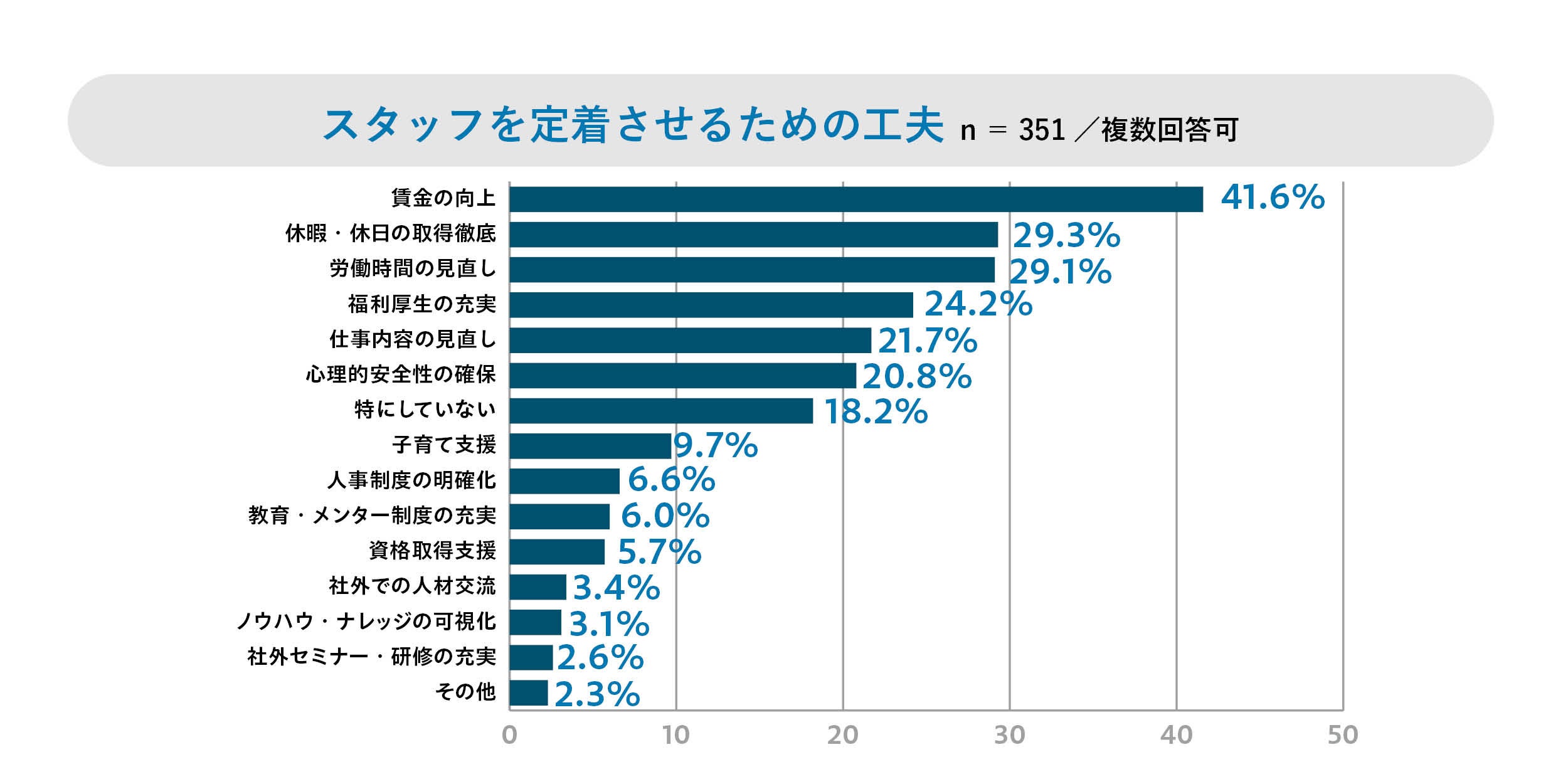 調査結果によると、41.6%の開業医がスタッフ定着のための主な工夫として「賃金の向上」を挙げました。これに続く取り組みとして「休暇・休日の取得徹底」が29.3%、「労働時間の見直し」が29.1%、「福利厚生の充実」が24.2%と労働条件や待遇の改善が上位を占めています。