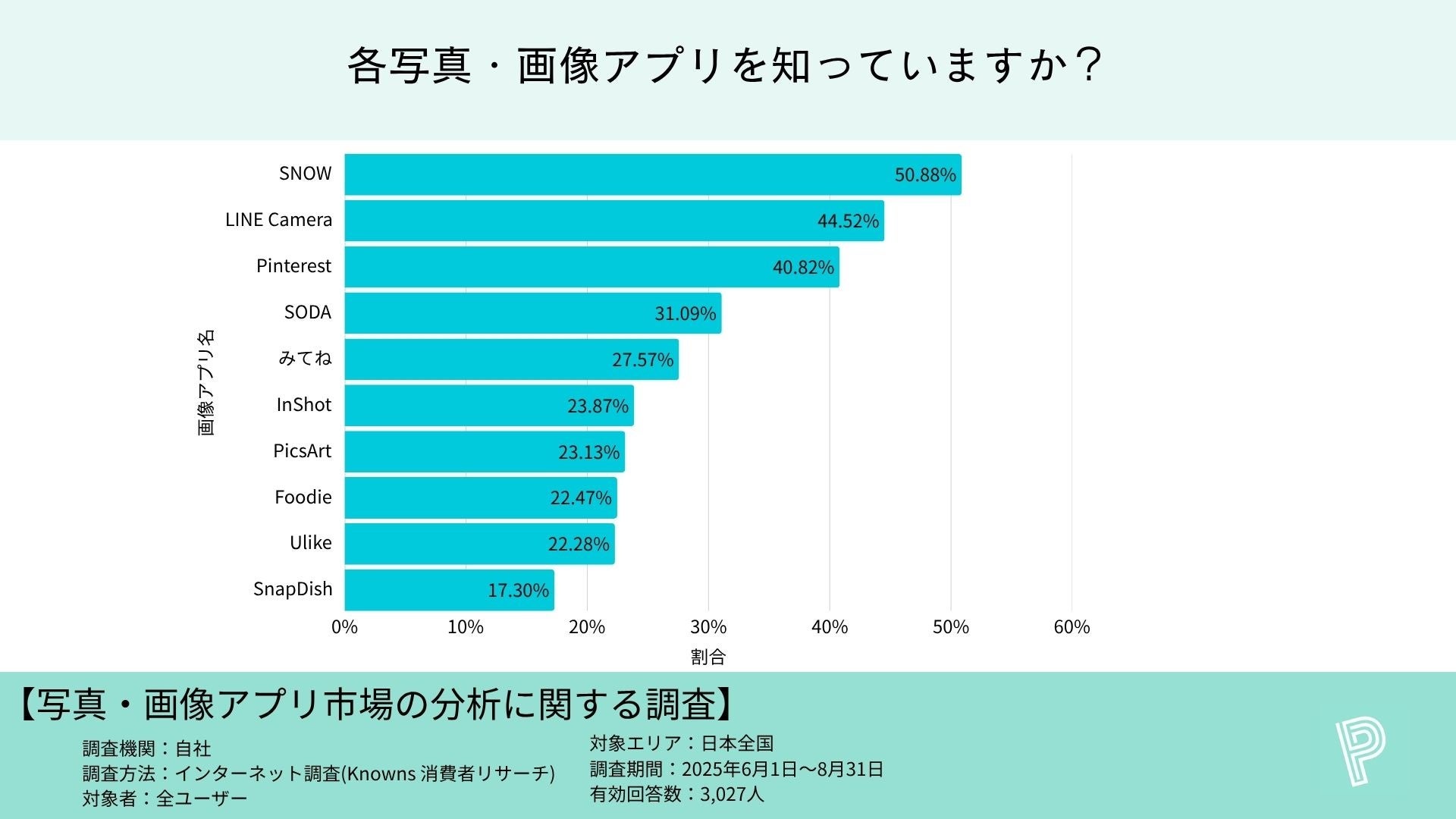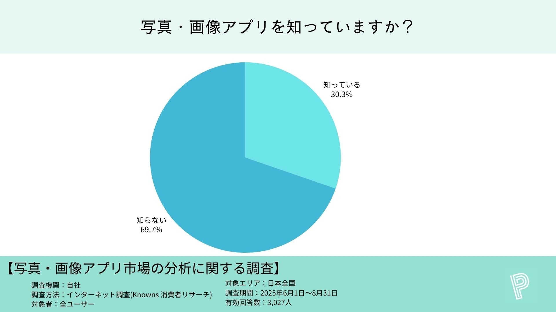 3,157名を対象にした結果、主要な写真・画像アプリの認知率は全体で30%にとどまりました。