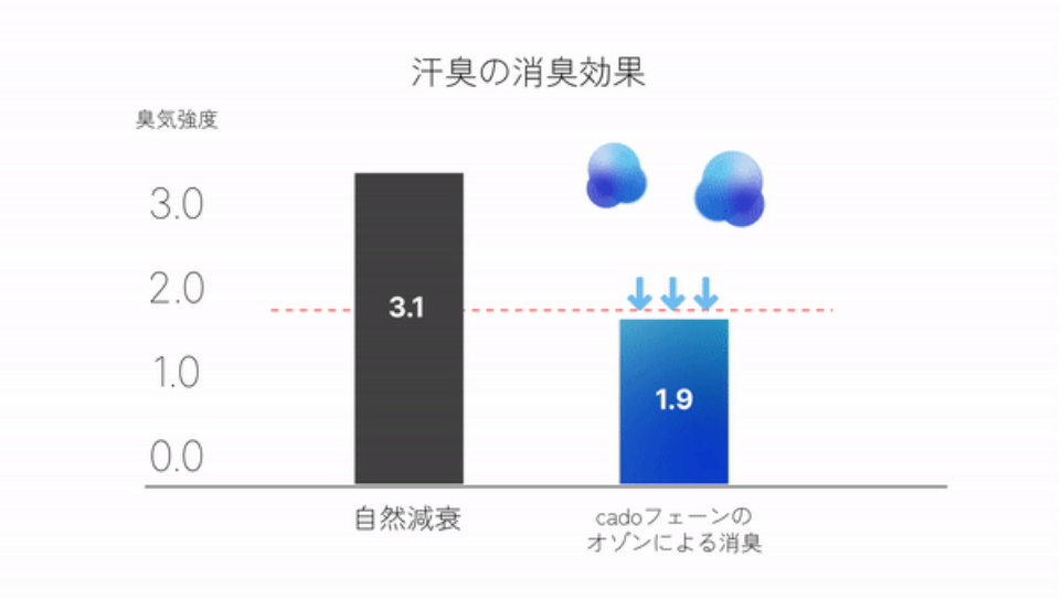 試験方法:自社調べ。疑似汗臭(アンモニア、酢酸、イソ吉草酸の混合臭気)を付着させた試験布を枕に貼り付け、送風モードでオゾン消臭運転。臭気判定士および複数名のパネラーにて6段階臭気強度法にて評価。