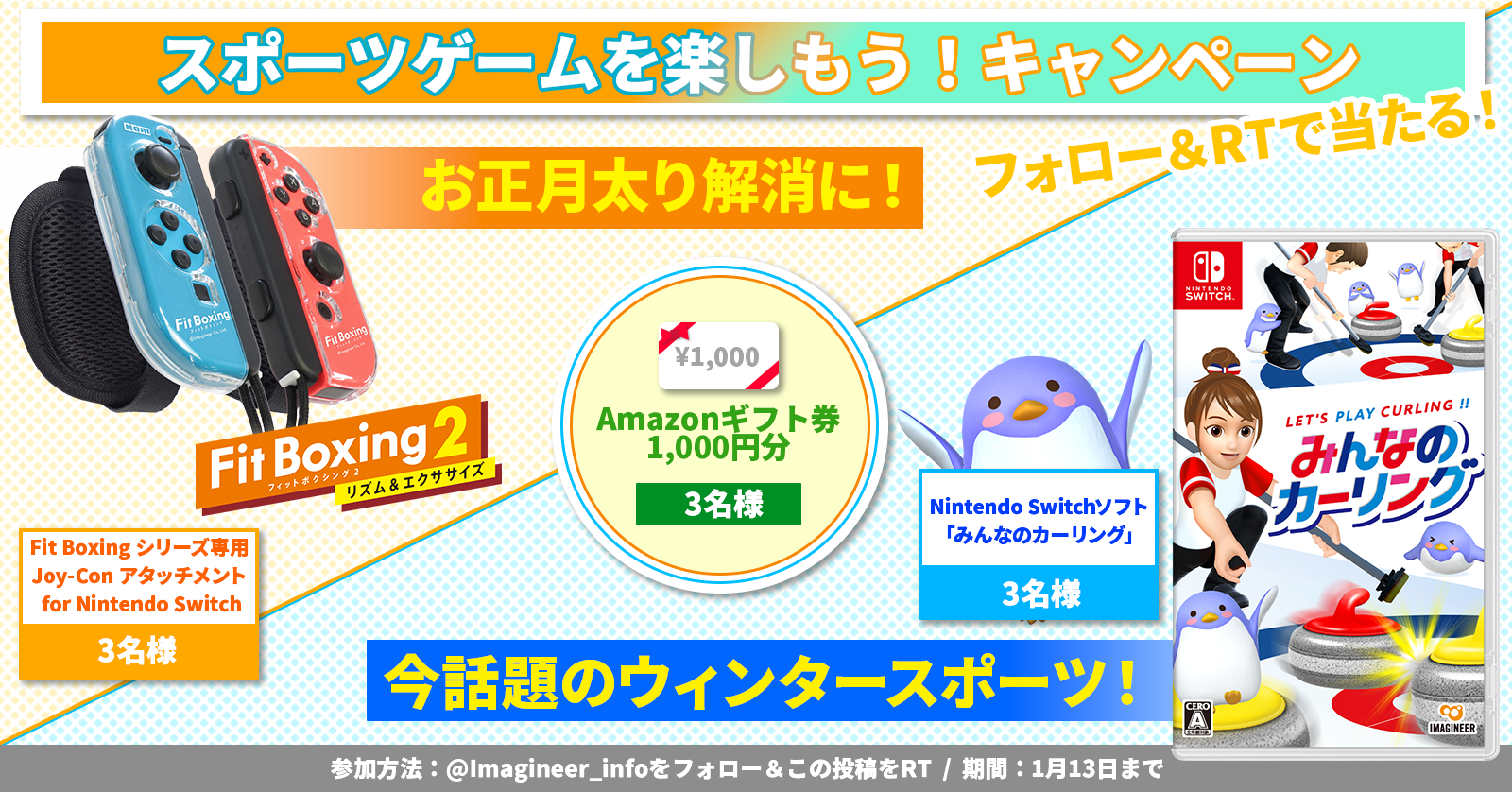 巣ごもりになりがちな寒い時期でもおうちでスポーツが楽しめるよう、「Fit Boxing シリーズ専用 Joy-Con アタッチメント」や Nintendo Switch ソフト「みんなのカーリング」(2/10 発売予定)が抽選でもらえるキャンペーンを明日 1 月 7 日より開催します。