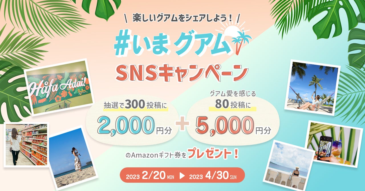 日本でも昨年10月に水際対策が緩和されて以降、グアム旅行予約も徐々に回復がみられています。今年5月には新型コロナの感染症法上の位置づけを5類に移行することが予定され、今後ますますの海外旅行需要の高まりが期待される中で、グアムを訪れる観光客に滞在中の楽しさを発信いただき、より多くの方々にグアム旅行を楽しんでいただけるよう、本キャンペーンを開催する運びとなりました。 2023年2月20日(月)~4月30日(日)までの全10週間を開催期間とし、その投稿の中から抽選で毎週30投稿に2,000円分、さらにグアムの魅力あふれる毎週8投稿には「Hafa Adai賞」として5,000円分、計380投稿にAmazonギフト券をプレゼントいたします。