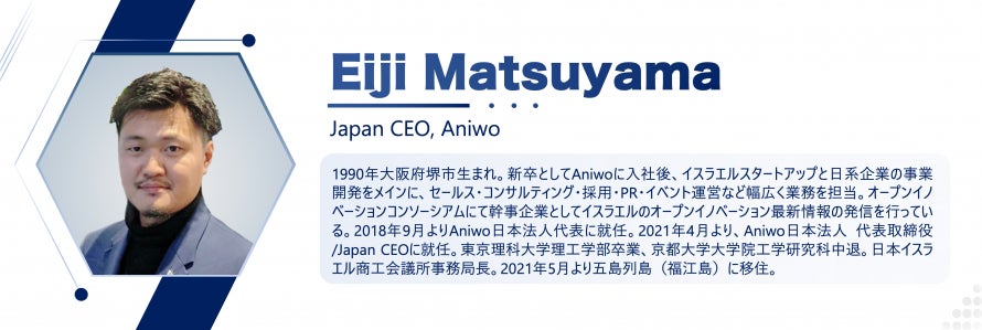1990年大阪府堺市生まれ。新卒としてAniwoに入社後、イスラエルスタートアップと日系企業の事業開発をメインに、セールス・コンサルティング・採用・PR・イベント運営など幅広く業務を担当。オープンイノベーションコンソーシアムにて幹事企業としてイスラエルのオープンイノベーション最新情報の発信を行っている。2018年9月よりAniwo日本法人代表に就任。2021年4月より、Aniwo日本法人 代表取締役/Japan CEOに就任。東京理科大学理工学部卒業、京都大学大学院工学研究科中退。日本イスラエル商工会議所事務局長。2021年5月より五島列島(福江島)に移住。