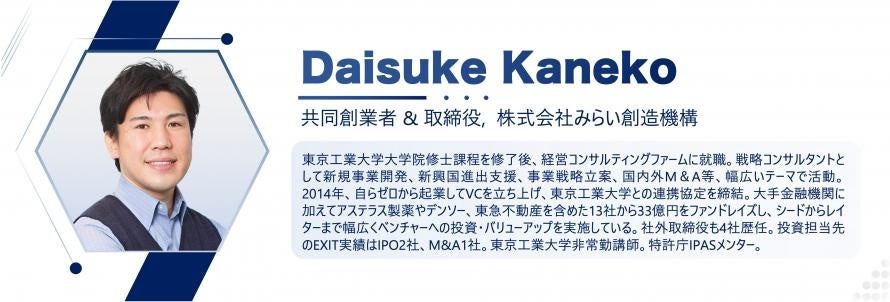 東京工業大学大学院修士課程を修了後、経営コンサルティングファームに就職。戦略コンサルタントとして新規事業開発、新興国進出支援、事業戦略立案、国内外M&A等、幅広いテーマで活動。2014年、自らゼロから起業してVCを立ち上げ、東京工業大学との連携協定を締結。大手金融機関に加えてアステラス製薬やデンソー、東急不動産を含めた13社から33億円をファンドレイズし、シードからレイターまで幅広くベンチャーへの投資・バリューアップを実施している。社外取締役も4社歴任。投資担当先のEXIT実績はIPO2社、M&A1社。東京工業大学非常勤講師。特許庁IPASメンター。