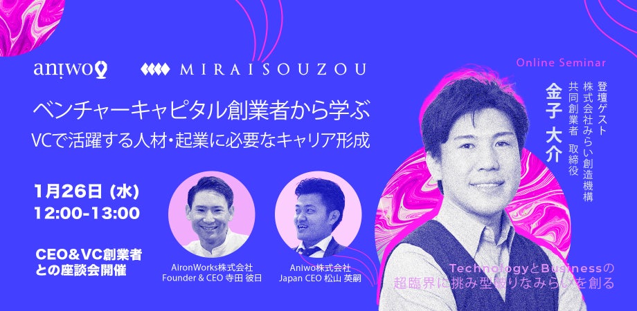 イスラエルと日本を拠点にイノベーションプラットフォーム・アドバイザリーサービスを提供するAniwo Ltd.(本社:テルアビブ, イスラエル、代表取締役:寺田 彼日・松山 英嗣、以下Aniwo)は、1月26日(水)12時より、VCへのキャリアチェンジやCXO/VPポジションを目指す方に向けたキャリアアップセミナー及び座談会を開催致します。