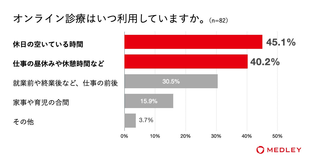 利用するタイミングについては「休日の空いている時間」(45.1%)、「仕事の昼休みや休憩時間など」(40.2%)と回答した人が多く、利用する理由としてあがっている「待ち時間・通院時間短縮のため」「オンラインでの予約ができるから」などからもわかる通り、 20〜30代を中心に仕事や育児等で忙しい中、スキマ時間を活用してオンラインでの診療を受けていることが伺える。