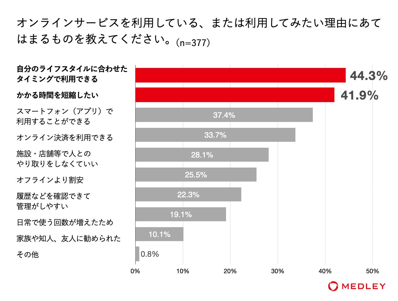 利用している理由は、「自分のライフスタイルに合わせたタイミングで利用できる」(44.3%)、「かかる時間を短縮したい」(41.9%)が上位となり、忙しい現代人のニーズにオンラインサービスが合致していた。