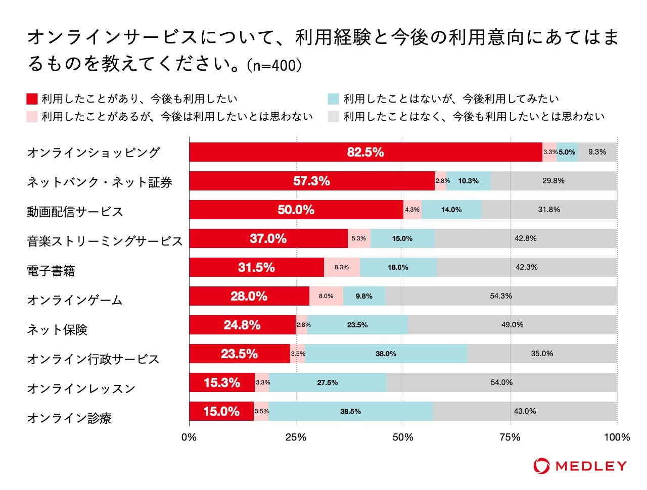 生活者のライフスタイルの変化に合わせて、近年、さまざまな分野でオンライン化が進んでいます。今回、メドレーでは、日々の生活を便利にする身近なオンラインサービスについて、活用しているサービスやメリットに感じていることなどを調査するために、インターネットによる意識調査を実施しました。併せて、オンライン診療の利用実態についてもアンケートを行っています。