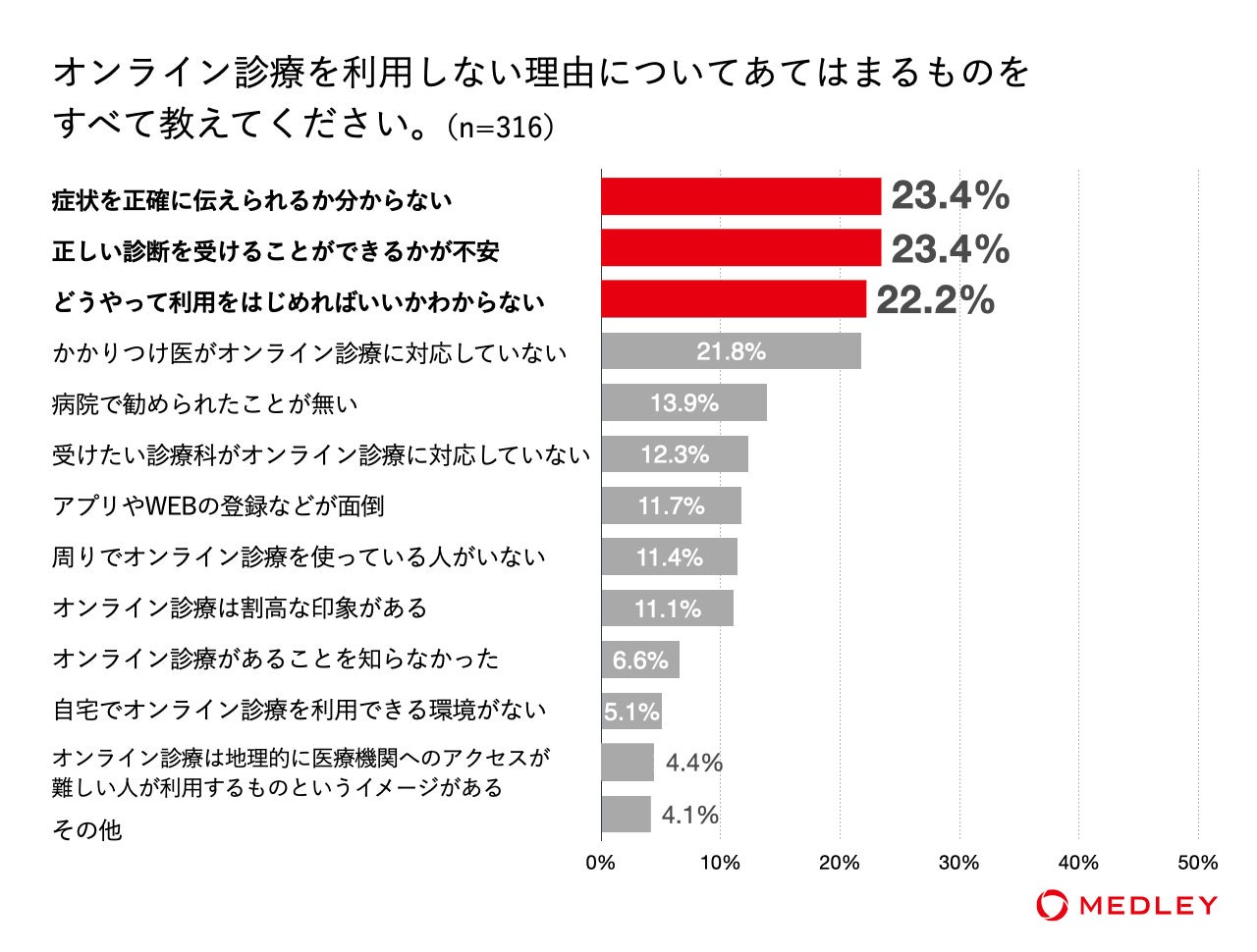 一方で、まだ利用したことのない人がオンライン診療を利用していない理由としては、「どうやって利用を始めればよいのかわからない」(22.2%)という回答が上位にあがりました。多くのオンライン診療ツールがスマートフォンのアプリなどで簡単に無料で登録できることや、医療機関の予約・診察・決済から処方薬の配送・服薬指導といった通院のプロセスがオンラインで完結することなど、オンライン診療の基本的な使い方や利便性が知られておらず、利用へのボトルネックとなっていることが示唆されました。
