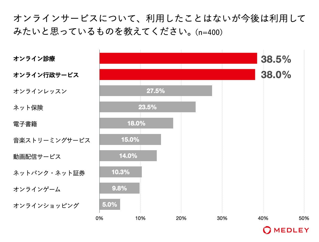 「利用したことはないが今後利用してみたい」と回答した人の比率が高いサービスは「オンライン診療」(38.5%)がトップ、次いで「オンライン行政サービス」(38.0%)となった。