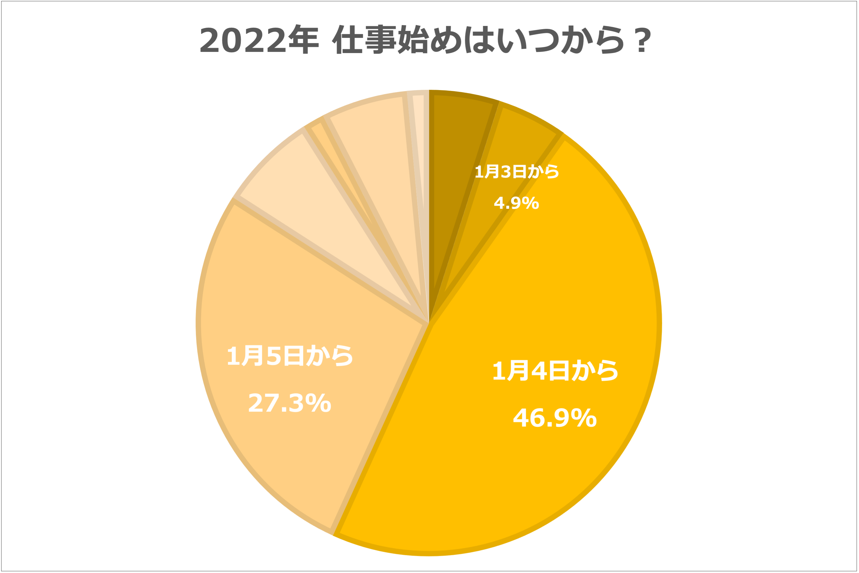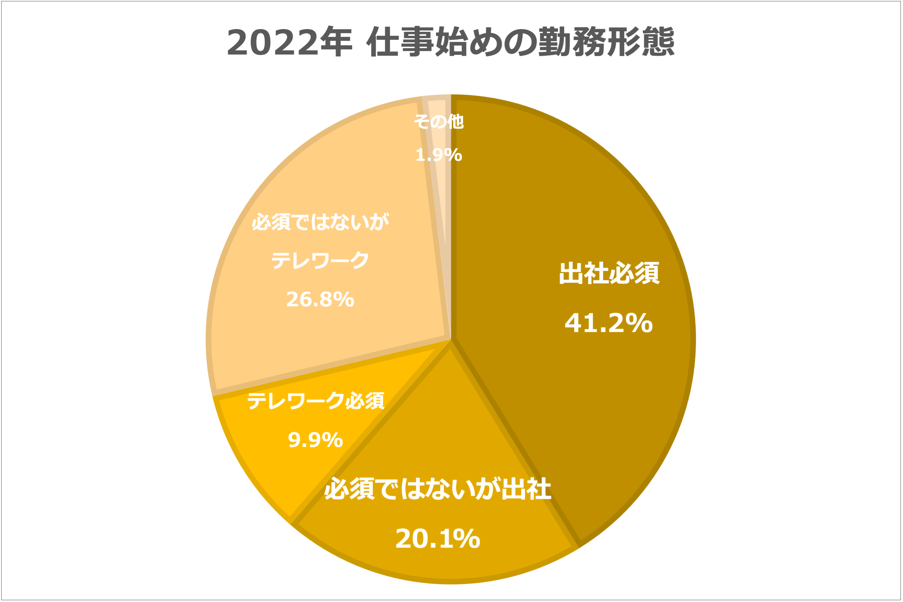 2022年の仕事始めは46.9%が1月4日で最多回答となり、仕事始めの勤務形態については「出社必須」41.2%と「必須ではないが出社」20.1%で、合算の61.3%が出社の勤務形態という回答になりました。また「テレワーク必須」9.9%、「必須ではないがテレワーク」26.8%で全体の36.7%がテレワークの回答結果になりました。