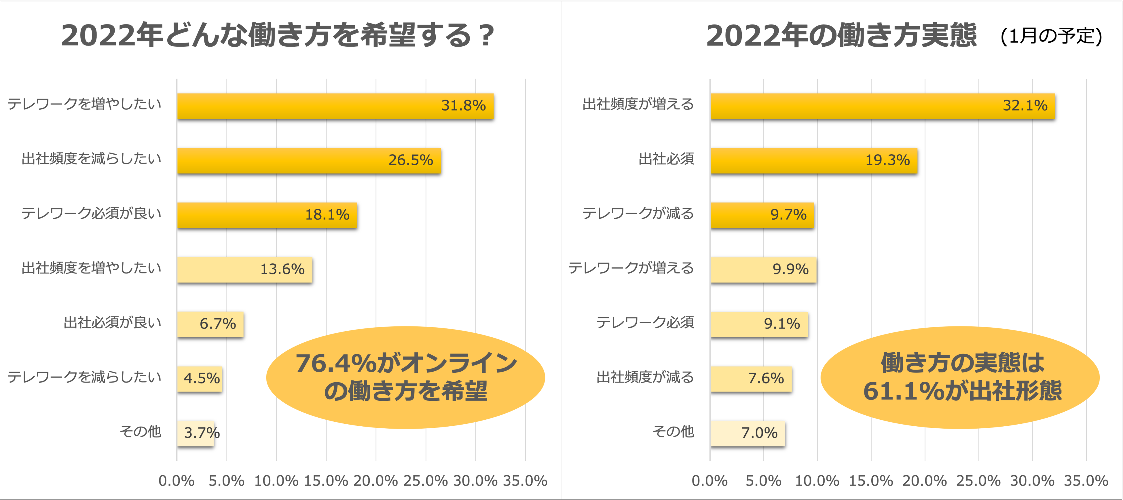 「2022年はどんな働き方を希望するか」の質問に、76.4%がオンラインによる働き方を希望する回答結果になりました。内訳は「テレワークを増やしたい」31.8%、「出社頻度を減らしたい」26.5%、「テレワーク必須が良い」18.1%で、「2022年の働き方実態(2022年1月の予定)」については、全体の61.1%が出社の勤務形態で、理想と現実のギャップがあることがわかりました。”2022年の働き方実態”の内訳は「出社頻度が増える」32.1%、「出社必須」19.3%、「テレワークが減る」9.7%の回答結果になりました。
