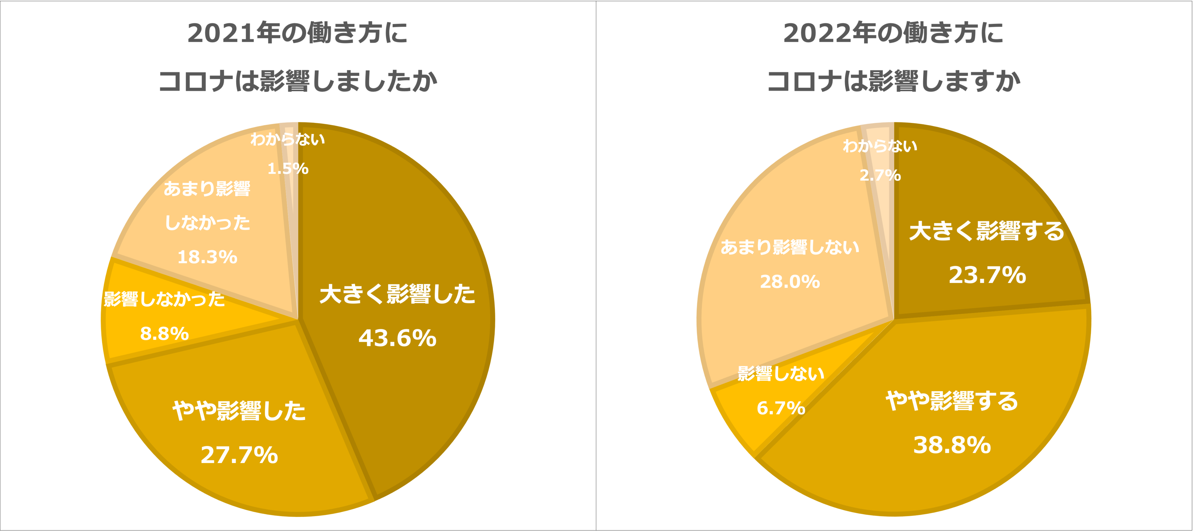 また、「2022年の働き方にコロナ禍が影響するか」については、「大きく影響する」23.7%、「やや影響する」38.8%で、全体の62.5%が”働き方に影響する”と回答しました。全体的に2021年から微減するものの、今年も多くの社会人の働き方に影響があることがわかりました。