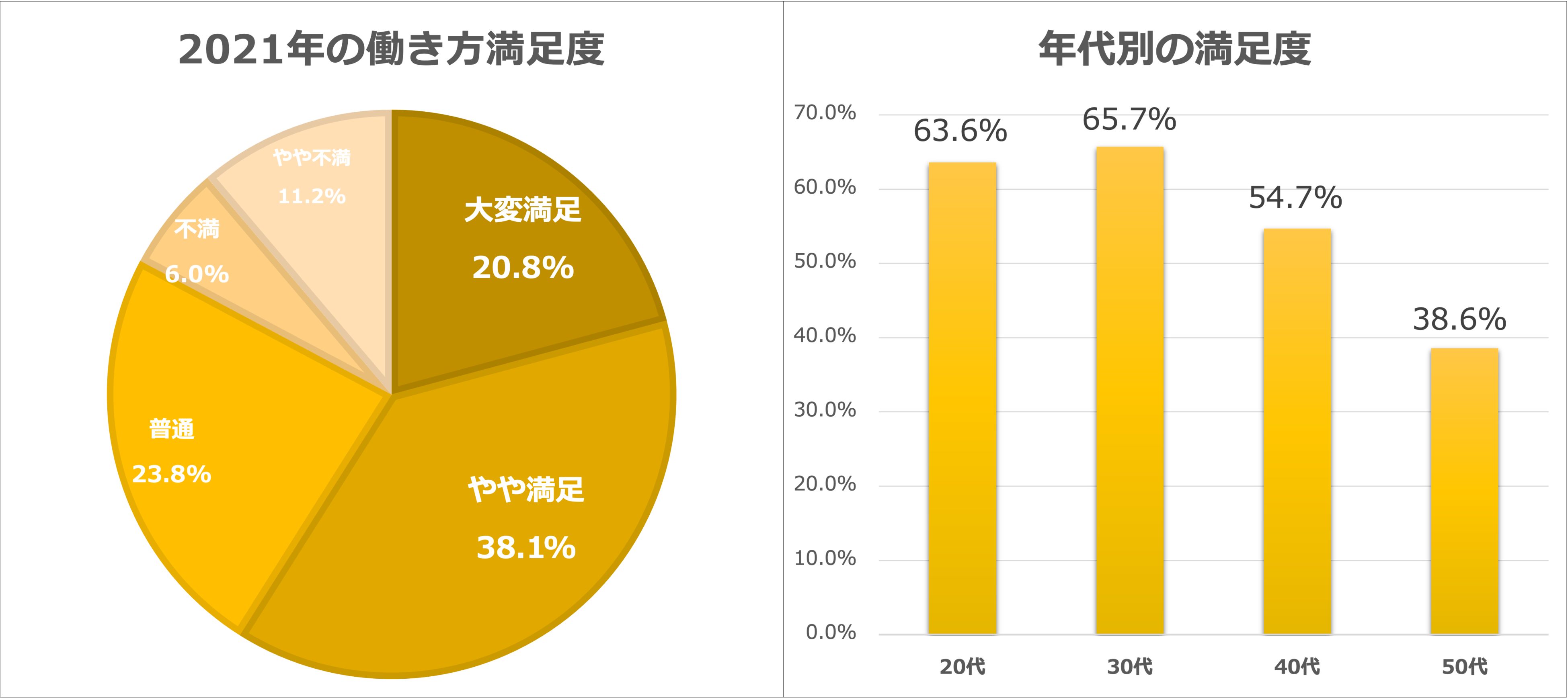 新型コロナ感染拡大により8割がテレワークを実施(2021年 テレワーク実態調査参照※2)した2021年の働き方満足度は「大変満足」20.8%、「やや満足」38.1%で、全体の58.9%が満足と回答しました。また、年代別の満足度を出すと、30代の満足度が最多の65.7%で、40代が54.7%、50代が最小の38.6%の回答結果で、30代以降年代が上がるに連れて満足度が低い結果になりました。