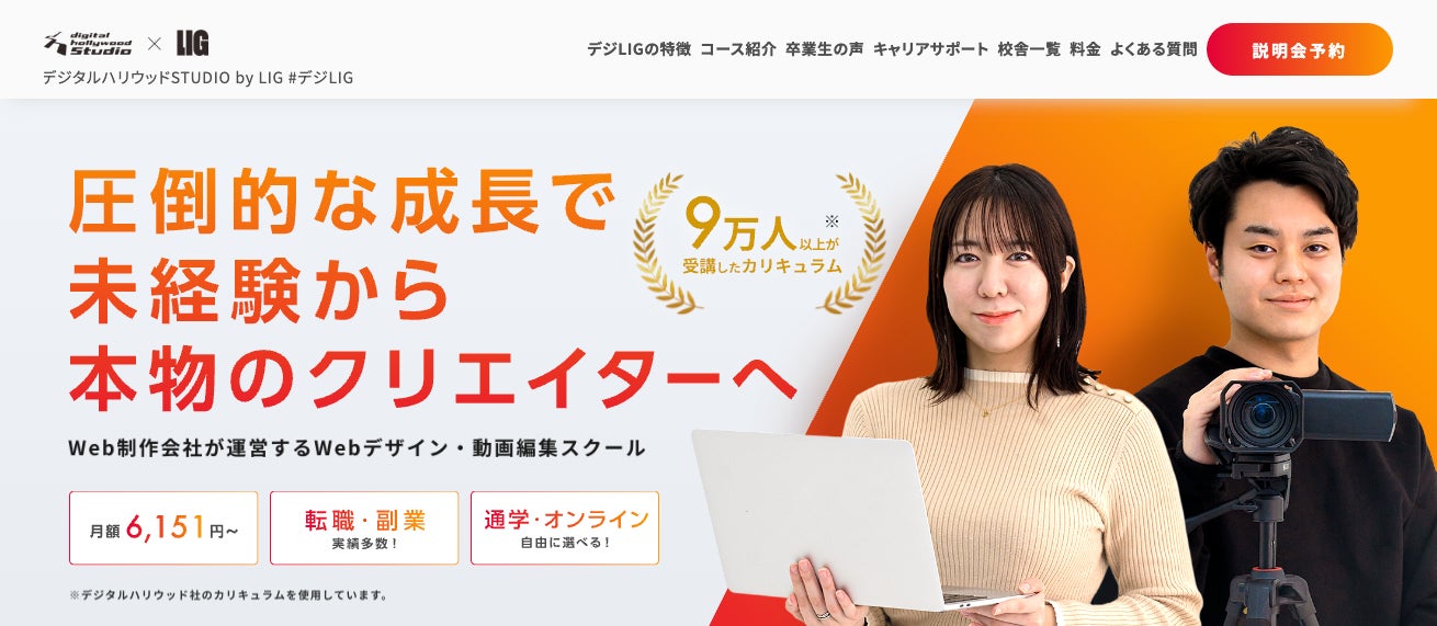 Web制作会社LIGと、30年以上の実績を持ち、これまでに10万人以上の卒業生を輩出するデジタルハリウッドが提携し運営する社会人向けWebクリエイタースクールです。