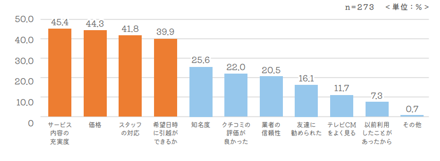 その中で既に引越業者を決めていると回答した 2 7 3 名に対し、その業者に決めた理由を聞いたところ、「サービス内容」が 4 5 .4%と最も多く、次いで「価格」(4 4 .3%)、「スタッフの対応」(41 .8%)そして「希望日時に引越ができるか」(39.9%)と、この4つが特に多く選ばれていました。