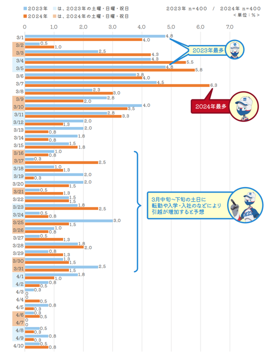 日別でみると昨年(2023年)のアンケート調査では3月1日(水)と3月5日(日)を予定する人が最多でしたが、今年は3月7日(木)に引越予定と回答した人が最も多く、ついで3月5日(火)が多くなるという結果でした。