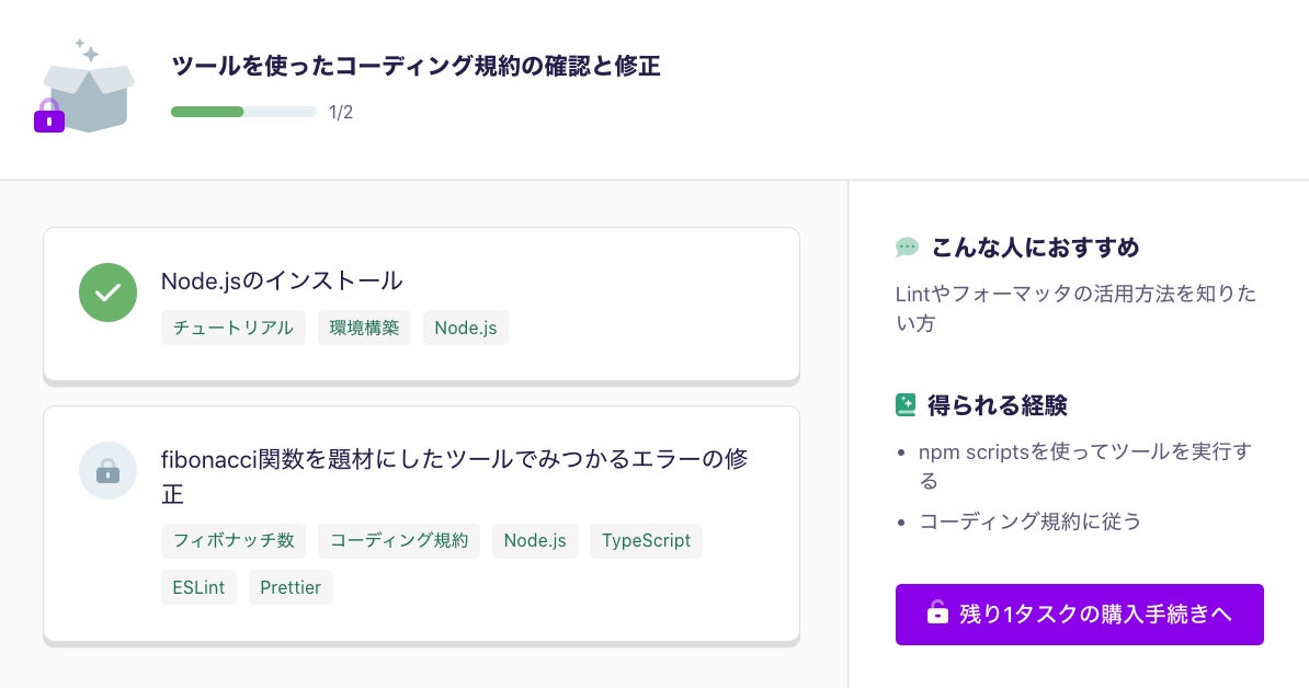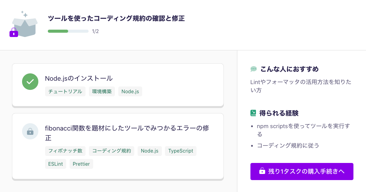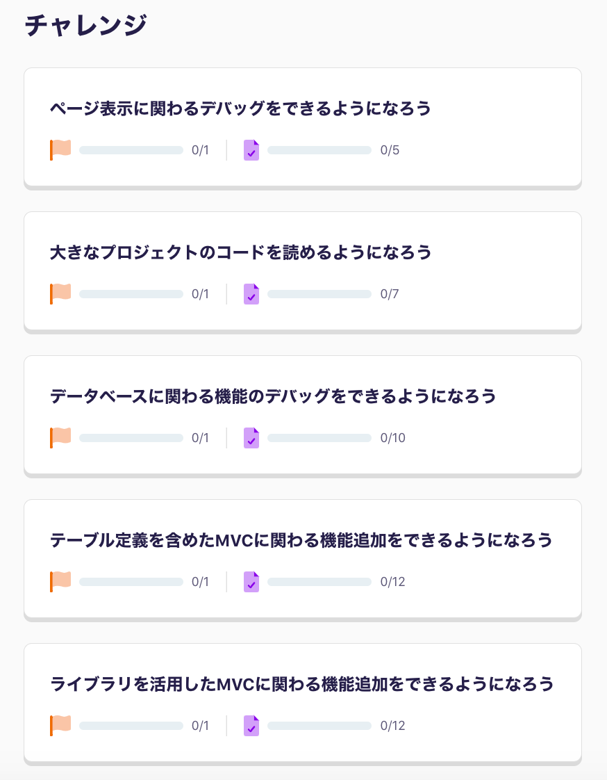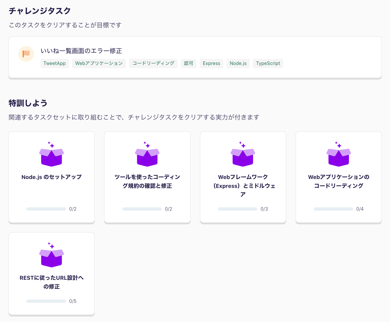 学習目的に対してチャレンジタスクと特訓タスクが用意されています。特訓タスクはチャレンジタスクに必要なスキルを分解した学習になっており、チャレンジタスクがクリアできない場合は特訓タスクで自分に必要なスキルを選択して学習することができます。