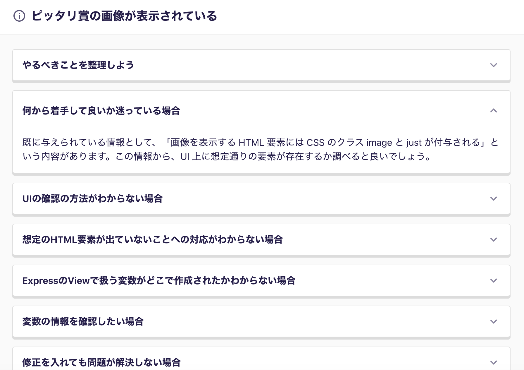 タスクの概要を読んだ後はセットアップを行い、実務と同じように仕様書を確認しながら試行錯誤を繰り返します。考えたり、調べてもわからないときには、詳しいアドバイスが用意されています。