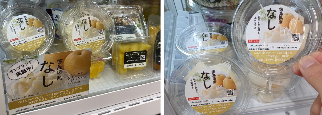 今回はJA全農とくしま様と、徳島県産梨のプロモーションを実施いたしました。梨を食べやすくカットしてカップに入れ、OFFICE DE YASAI の売り場において無料サンプリングいたしました。