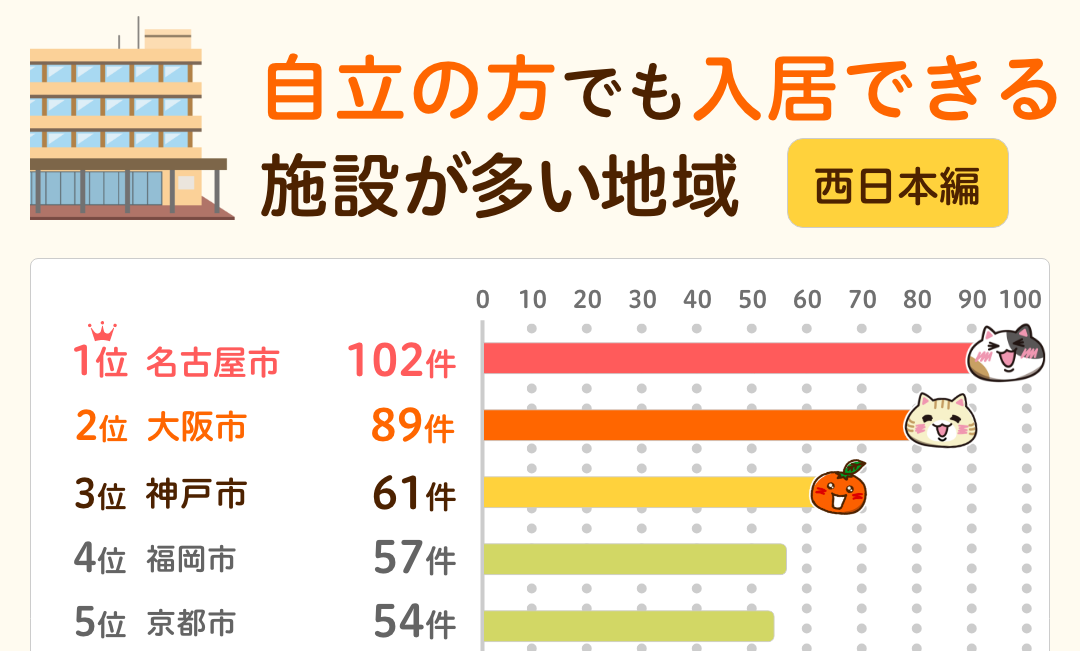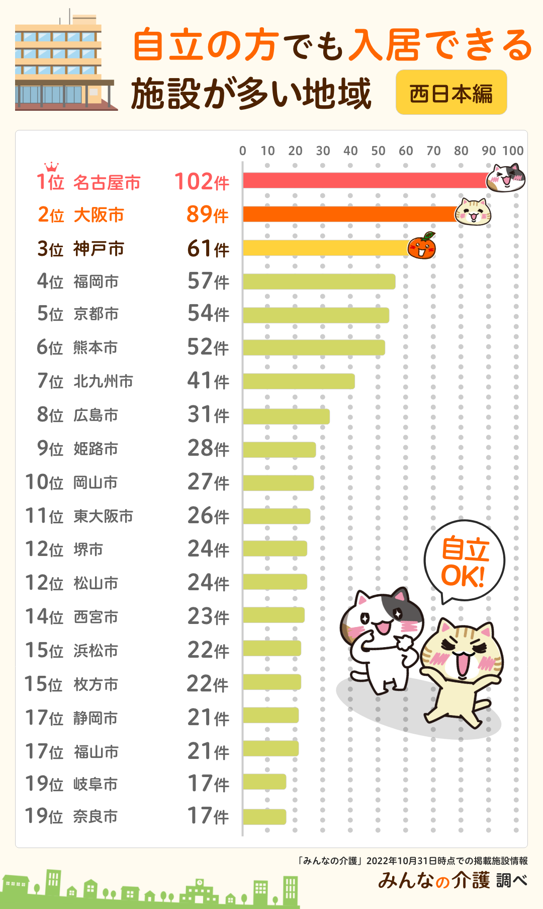 - 算出方法:西日本(静岡・愛知・岐阜・富山・石川・福井・大阪・京都・兵庫・奈良・三重・滋賀・和歌山・岡山・鳥取・島根・広島・山口・香川・徳島・愛媛・高知・福岡・佐賀・長崎・大分・熊本・鹿児島・沖縄)に所在する、自立の方でも入れる介護施設数を算出