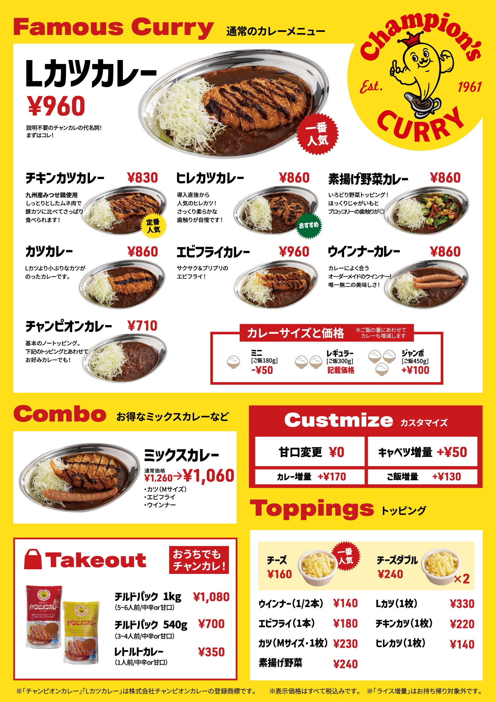 〇販売メニュー:Lカツカレー、ウインナーカレー、チャンピオンカレーのみ
