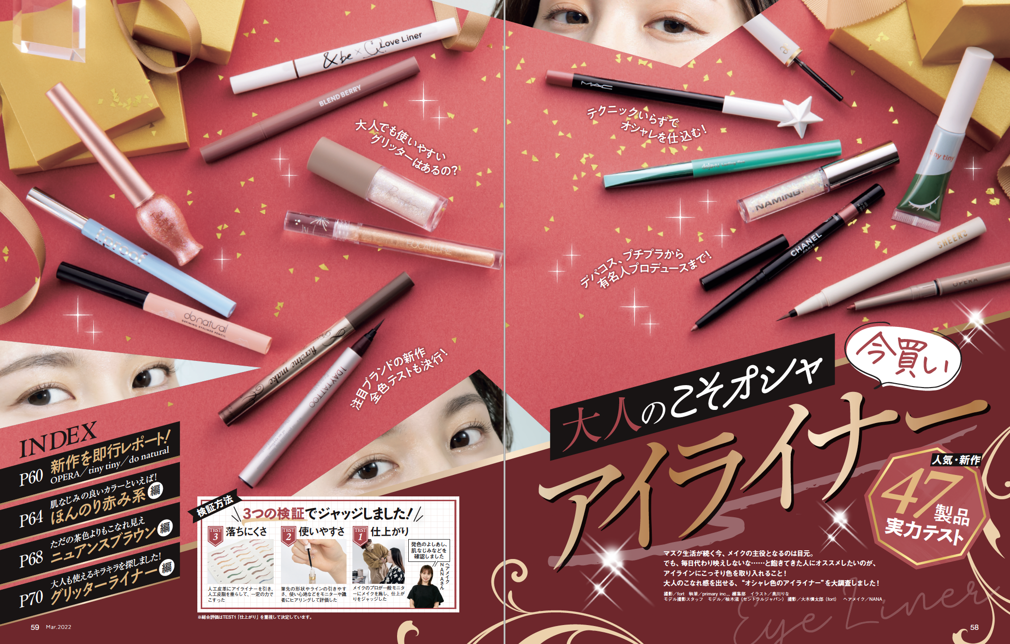 3月号では、1枚1000円超えのシートマスクから話題の韓国マスクまで69製品を集めて一斉テスト! うるおいたっぷりでメイクのりまでアップする万能マスクを探しました。巻頭特集では、SNSや美容誌で話題の最先端美容系アイテムの実力をプロと一緒に本気でチェック。そのほかにも、大人女性の目元をオシャレに演出する「アイライナー」や、テクいらずでベースメイクがキレイに仕上がる「メイクブラシ」など、キレイを叶える情報盛りだくさんでお届けしています!