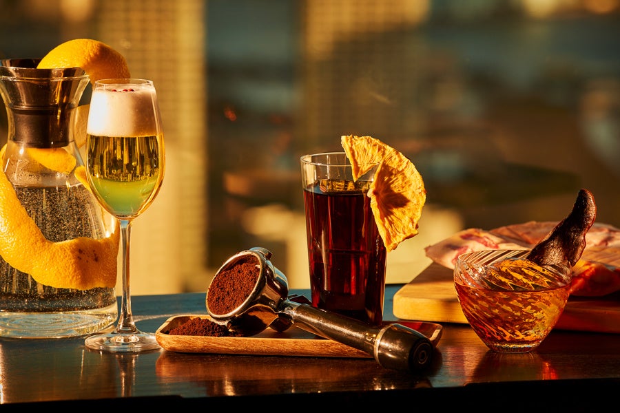 ネグローニをウイスキーベースにアレンジし、イタリア、公爵、牛肉のイメージから転じて最後の晩餐を表現しました。ホテル51階のメインダイニング「ザ タヴァン グリル&ラウンジ」で使用する雪室熟成肉で廃棄される牛脂部分の旨味成分だけを抽出し使用した、海外でトレンドのファットウォッシュカクテルです。甘夏の皮で初夏の爽やかな香りをまとわせた心地よい後味をお楽しみください。ガーニッシュには、甘夏の果肉と通常破棄する牛すじ部分の肉を合わせ、ミクソロジスト自らビーフジャーキーに仕立てました。甘みと2塩味のハーモニー、そして甘夏の甘酸っぱい香りが初夏にぴったりのプレミアムカクテルをぜひご賞味ください。