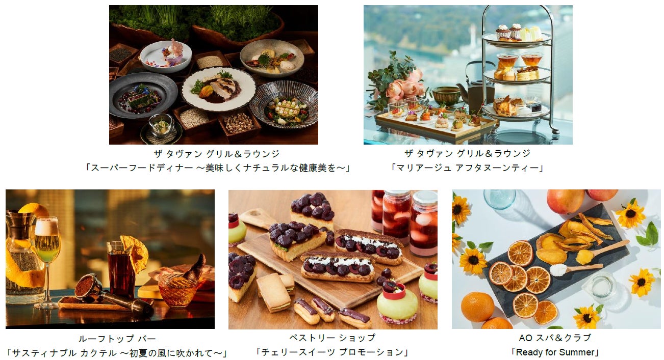 「ザ タヴァン グリル&ラウンジ」では、栄養価の高い食材として海外のセレブからも注目されている「スーパーフード」をふんだんに使用したオリジナルコースメニューを、ラウンジでは、『マリアージュ』をテーマにあらゆる食材のハーモニーを一品ごとに楽しめるアフタヌーンティーをご用意いたします。「ルーフトップ バー」では、『サスティナブル』と題し、通常は破棄されるフルーツの皮やコーヒー豆の出がらしを使用し、自然や環境に配慮したユニークなカクテルを3種類ご提供いたします。「ペストリー ショップ」では、疲労回復に良いとされる旬で美味な『チェリー』を贅沢に使用したスイーツの数々を種類豊富にご用意いたします。「AO スパ&クラブ」では、気候の変化による心身の疲れやストレスを取り除き、夏に向けての美肌も意識した限定メニューをご用意し、皆さまをお迎えいたします。