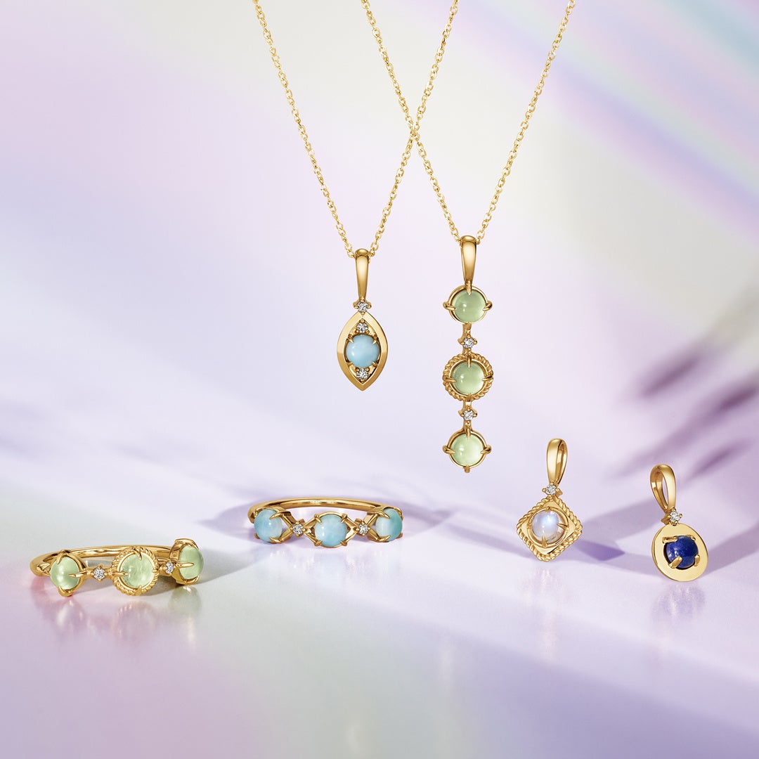 春の訪れを印象付けるブルー、グリーンを中心とした瑞々しいカラーで穏やかな春の空気感を表現。カボションカットの丸みのある滑らかで潤いに満ちたストーンが引き立つ、上品でシックな佇まいが魅力です。お持ちのチェーンやフープに合わせることで自在なアレンジが可能。春らしいリラックスムードに包まれながら、「わたし」だけのコーディネートをお楽しみいただけます。
